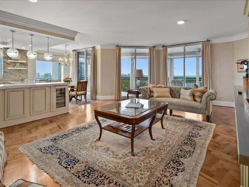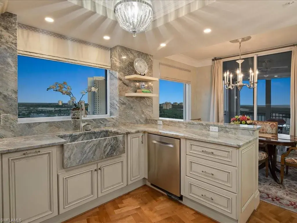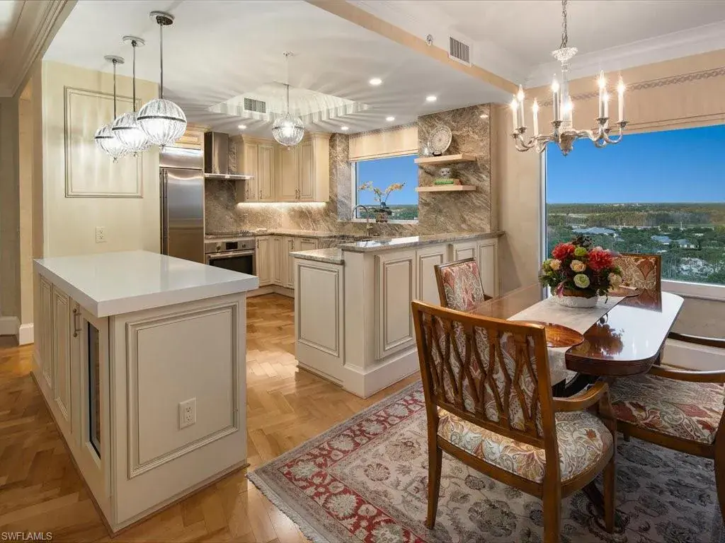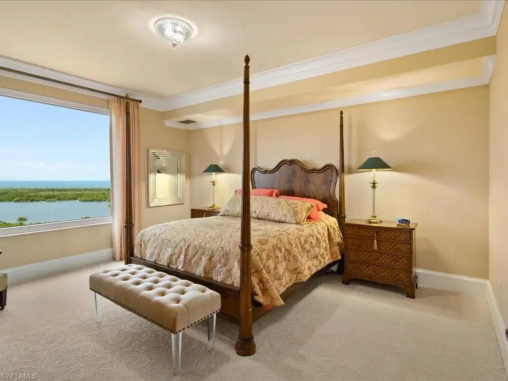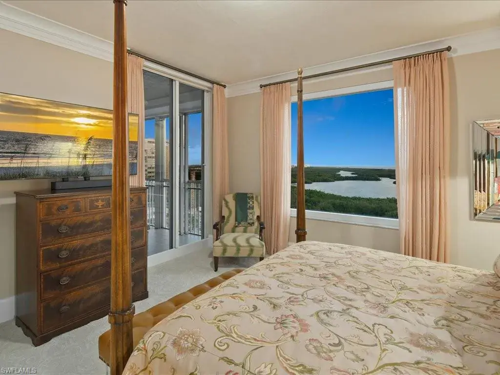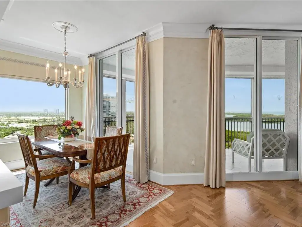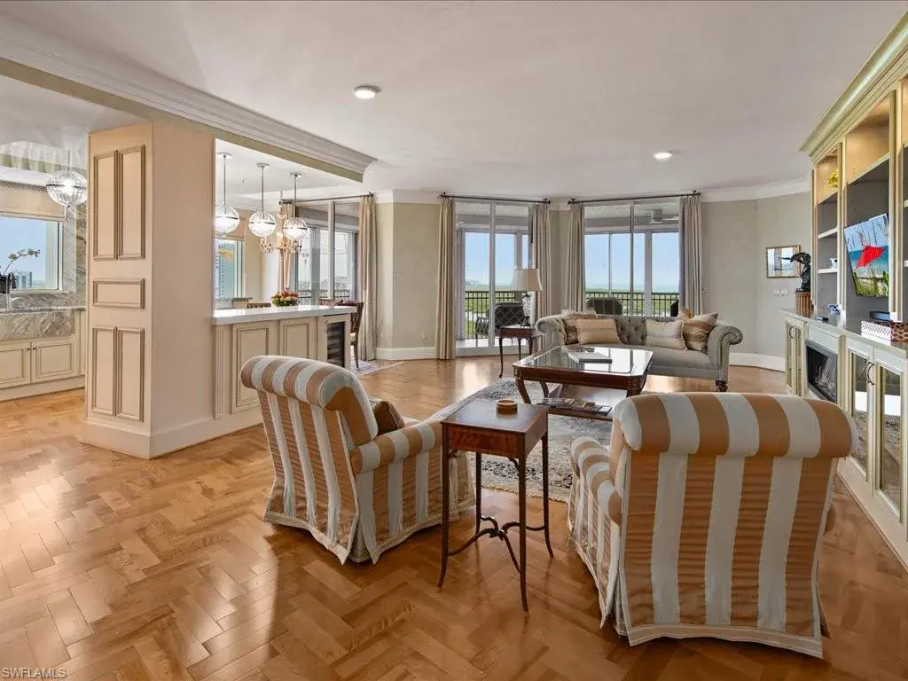 Presenting #1101 in Tower Pointe in the amenity-rich, 55+ Active Senior Community of Arbor Trace. This luxurious, three bedroom, 2.5 bath end unit located in the coveted ’01 stack with Southwest exposure, features panoramic, unobstructed vistas of Little Hickory Bay and the Gulf of Mexico. A one-year labor of love by Foxworthy Interiors completed in 2018, this impressive 11th story sky residence was totally and extensively renovated from top to bottom with high level finishes to the tune of $400,000 with no stone left unturned and no corners cut, and curated with an eye towards ageless elegance. Custom moldings throughout including beautiful wood floors with custom inlays. The great room is warm and inviting with a custom lighted wall unit including electric fireplace. The well-appointed kitchen was opened to the living room and features custom cabinetry, granite and porcelain counter tops, farmer’s sink, Bosch/GE Monogram stainless-steel appliances including wine cooler. Large, private master retreat with superb bay/gulf views, impressive custom closet system and quality master bath that will surely pamper the most discerning of owners. The third bedroom with built-in closet system and murphy bed could also be used as an office/den/study. NEW in 2023/2024: Trane HVAC with medical grade air filtration system, water heater with water filtration system, Electrolux washer and dryer, Fabrica sculptured wall-to-wall carpet in the master retreat, Delta kitchen faucet and lanai screening. There are also electric window blinds on the kitchen and dining room windows as well as electric hurricane shutters on the lanai. This unit also comes with extra air-conditioned storage as well as a one car garage. Arbor Trace is a pet friendly 55+ active independent adult living community. Feel as though you are on vacation every day with wonderful amenities that include heated pool/spa, fitness center, card room, library, billiards room, bocce ball, pickleball, active social calendar, hair salon, two guest suites, movie nights, 17th floor club as well as 36,000 sq. ft. clubhouse with on-site fine dining. Additional services include local transportation, housekeeping, and 24 hour emergency monitoring for peace of mind. This tasteful residence is one you will feel proud to own. Even the lovely art and furnishings are negotiable. Also be sure to inquire about the future option to move to the adjacent Assisted Living Property at Arbor Glen if future planning requires. Active, independent adult living never looked this great!