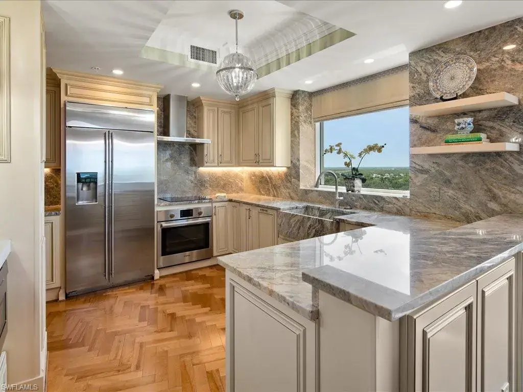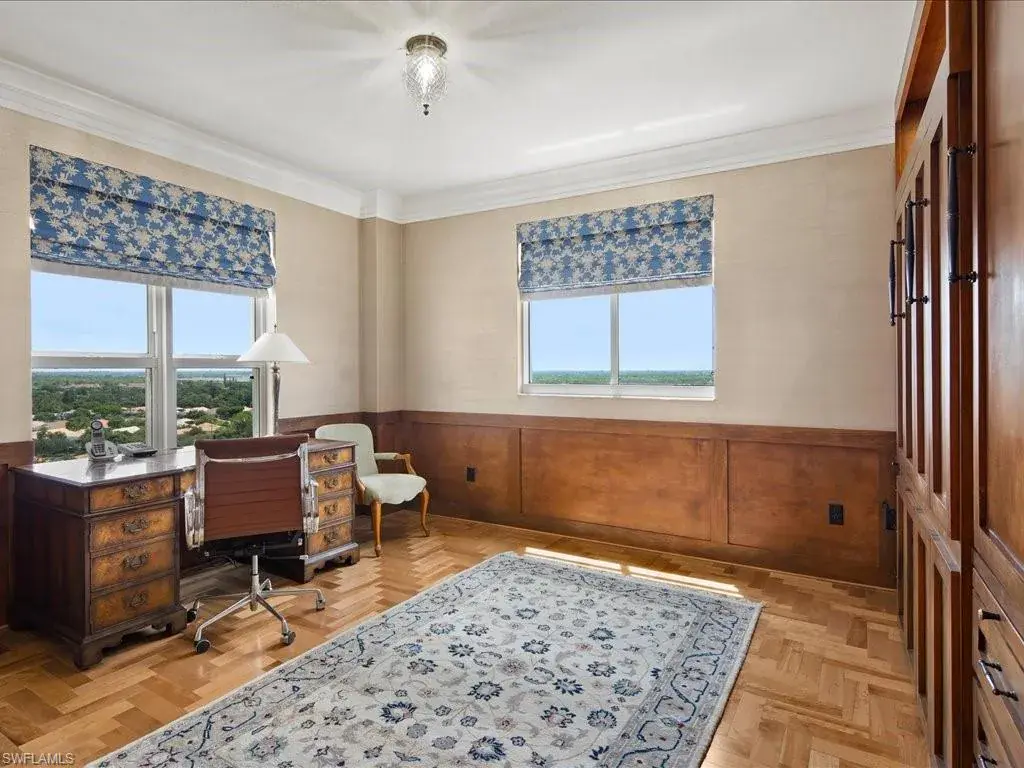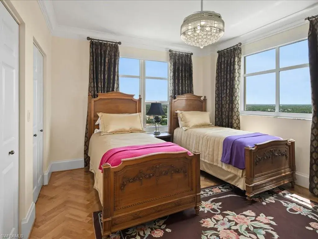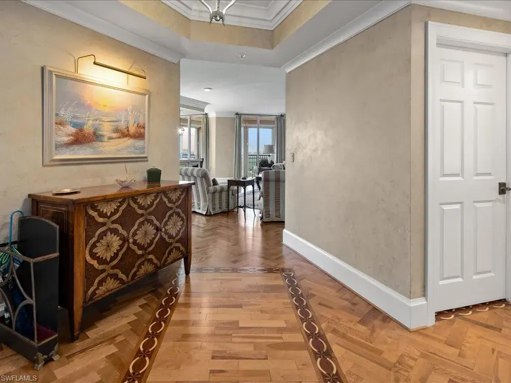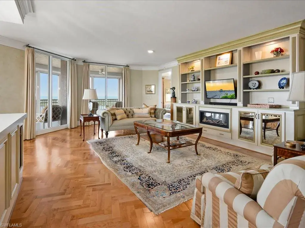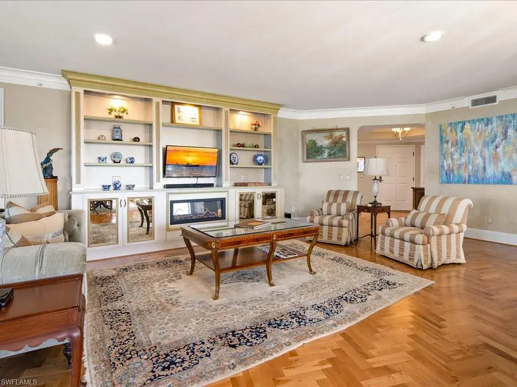 Presenting #1101 in Tower Pointe in the amenity-rich, 55+ Active Senior Community of Arbor Trace. This luxurious, three bedroom, 2.5 bath end unit located in the coveted ’01 stack with Southwest exposure, features panoramic, unobstructed vistas of Little Hickory Bay and the Gulf of Mexico. A one-year labor of love by Foxworthy Interiors completed in 2018, this impressive 11th story sky residence was totally and extensively renovated from top to bottom with high level finishes to the tune of $400,000 with no stone left unturned and no corners cut, and curated with an eye towards ageless elegance. Custom moldings throughout including beautiful wood floors with custom inlays. The great room is warm and inviting with a custom lighted wall unit including electric fireplace. The well-appointed kitchen was opened to the living room and features custom cabinetry, granite and porcelain counter tops, farmer’s sink, Bosch/GE Monogram stainless-steel appliances including wine cooler. Large, private master retreat with superb bay/gulf views, impressive custom closet system and quality master bath that will surely pamper the most discerning of owners. The third bedroom with built-in closet system and murphy bed could also be used as an office/den/study. NEW in 2023/2024: Trane HVAC with medical grade air filtration system, water heater with water filtration system, Electrolux washer and dryer, Fabrica sculptured wall-to-wall carpet in the master retreat, Delta kitchen faucet and lanai screening. There are also electric window blinds on the kitchen and dining room windows as well as electric hurricane shutters on the lanai. This unit also comes with extra air-conditioned storage as well as a one car garage. Arbor Trace is a pet friendly 55+ active independent adult living community. Feel as though you are on vacation every day with wonderful amenities that include heated pool/spa, fitness center, card room, library, billiards room, bocce ball, pickleball, active social calendar, hair salon, two guest suites, movie nights, 17th floor club as well as 36,000 sq. ft. clubhouse with on-site fine dining. Additional services include local transportation, housekeeping, and 24 hour emergency monitoring for peace of mind. This tasteful residence is one you will feel proud to own. Even the lovely art and furnishings are negotiable. Also be sure to inquire about the future option to move to the adjacent Assisted Living Property at Arbor Glen if future planning requires. Active, independent adult living never looked this great!