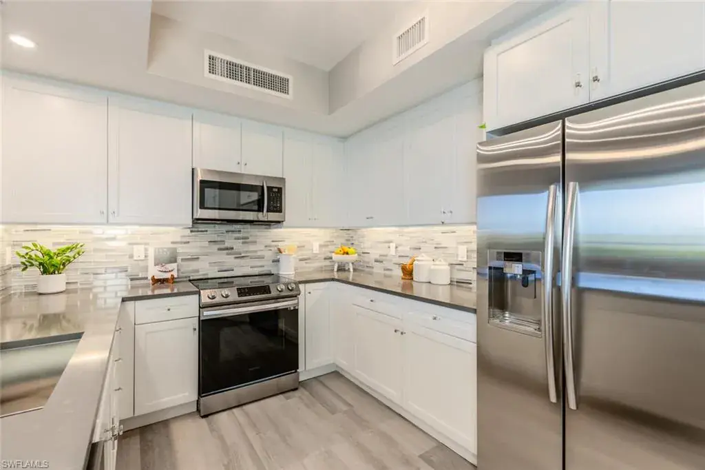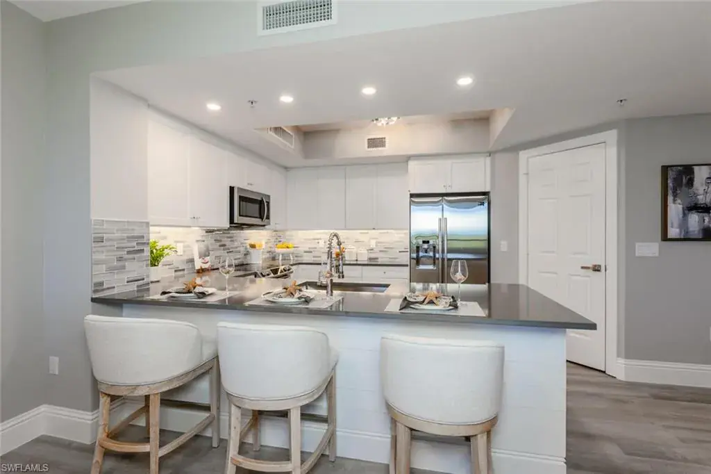 Just updated, this 3 bedroom, 2 1/2 bath is waiting for you. New flooring, fresh paint throughout, new light fixtures, new countertops, stainless steel appliances. Staged so you imagine relaxing and entertaining in the Southwest Florida lifestyle you would expect. Amenities abound with a sparkling pool, rejuvenating hot tub, and two BBQ grills for al fresco dining. The social room offers a chic space for gatherings, complemented by a fully-equipped gym for fitness enthusiasts. Movie nights become a grand affair in the dedicated theater room. Assigned covered parking ensures convenience, while the availability of guest suites caters to visiting friends and family. Enjoy sunsets from your private screened lanai overlooking Rooker Bay. Nestled between Marco Island and Naples, this residence embodies the best of both worlds — a serene retreat with proximity to the vibrant offerings of two coastal gems. Your dream home awaits in the gated community of Hammock Bay.