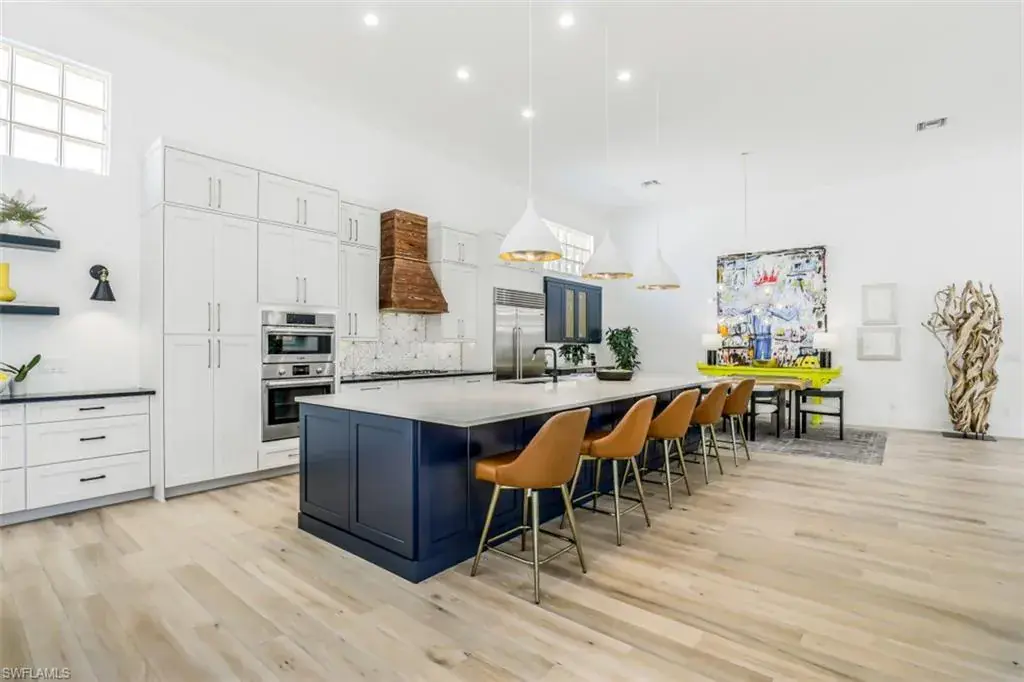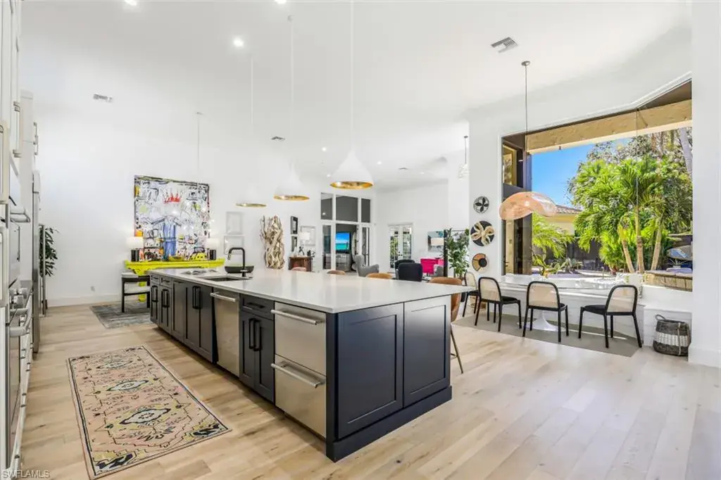 Grand Isle Drive features soaring ceilings and an abundance of windows flooding this courtyard style home with natural light. This former developer model sits on one of the largest sites in a cul-de-sac. Interior features include beautiful white oak hardwood floors in the main home, renovated chef’s kitchen with oversize island with two refrigerator drawers, gas cooktop, two beverage stations with wine fridge and ice maker, custom wood cabinetry, Quartzite countertops, and Sub Zero Refrigerator, Bosch & Thermador, appliance package. The “Great Room” floor plan enhances the beautiful southern exposure views upon the 2,958 sq/ft lanai and pool area which adds natural light through the entire living area. The main house provides over 3,400 sq/ft while the two story 1,446 sq/ft guest cabana offers its own living area with two additional bedrooms and bathrooms and sauna. The 1st floor primary suite and study open to another lanai with gorgeous golf course views. The home flows beautifully out to the courtyard with a 40 ft pool and spa with privacy wall, enhanced with lush tropical landscaping. **X FLOOD ZONE, NEW AC’S (3) NEW WATER HEATER (2), RENOVATED KITCHEN AND BATHS.**