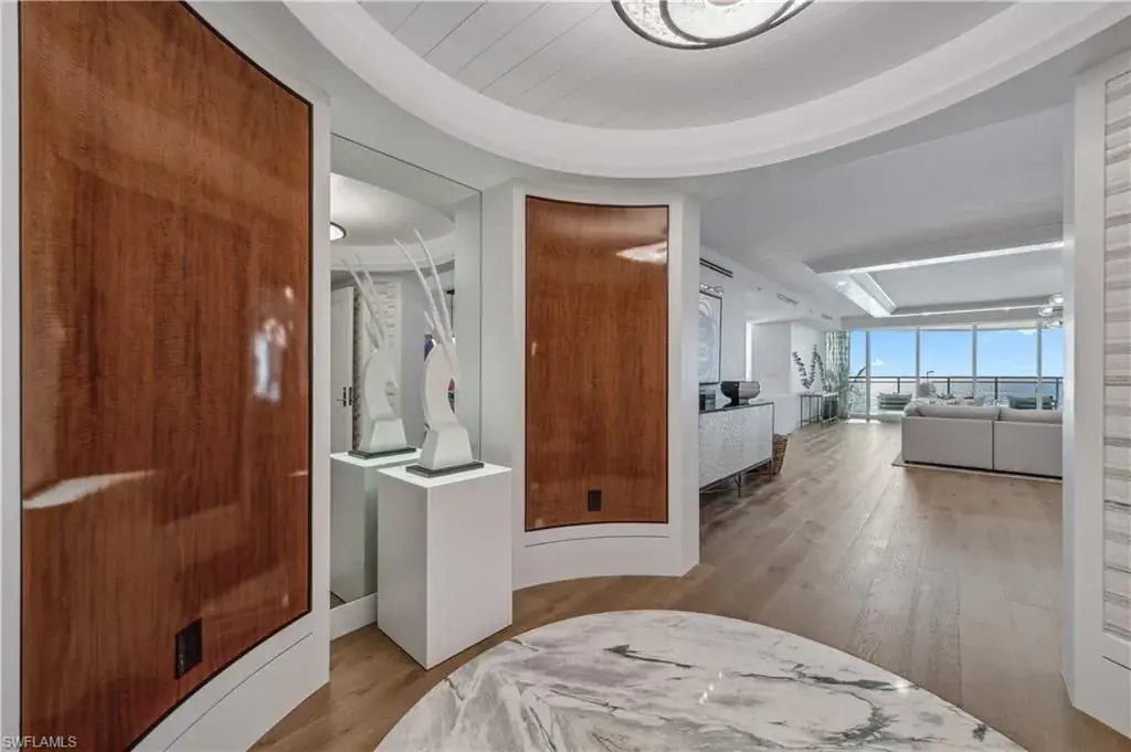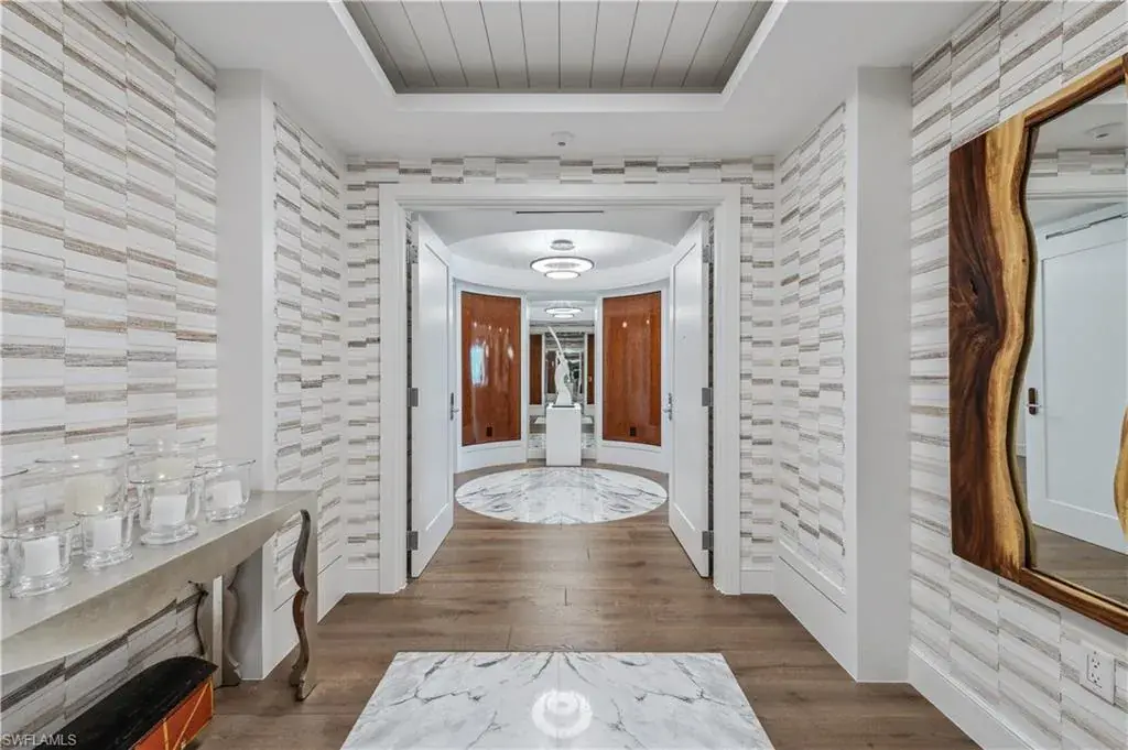 Exquisite 10th-Floor Residence at Moraya Bay. Gorgeous elevator entrance with marble and wood floor inlay, and wood floors throughout — offering over 4,500 sq. ft. of refined interior living and more than 700 sq. ft. of stunning outdoor space.