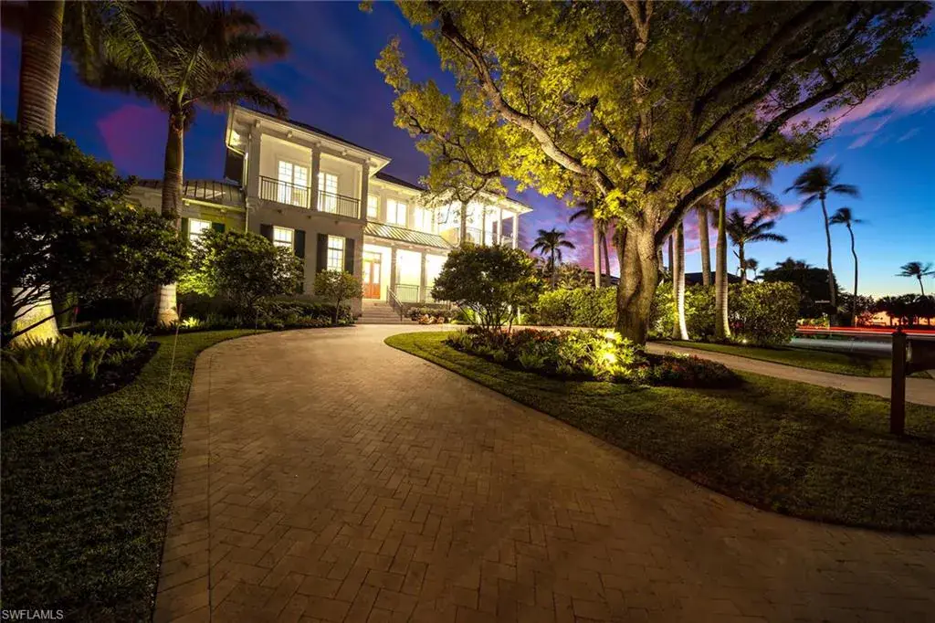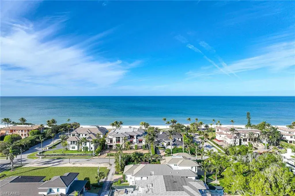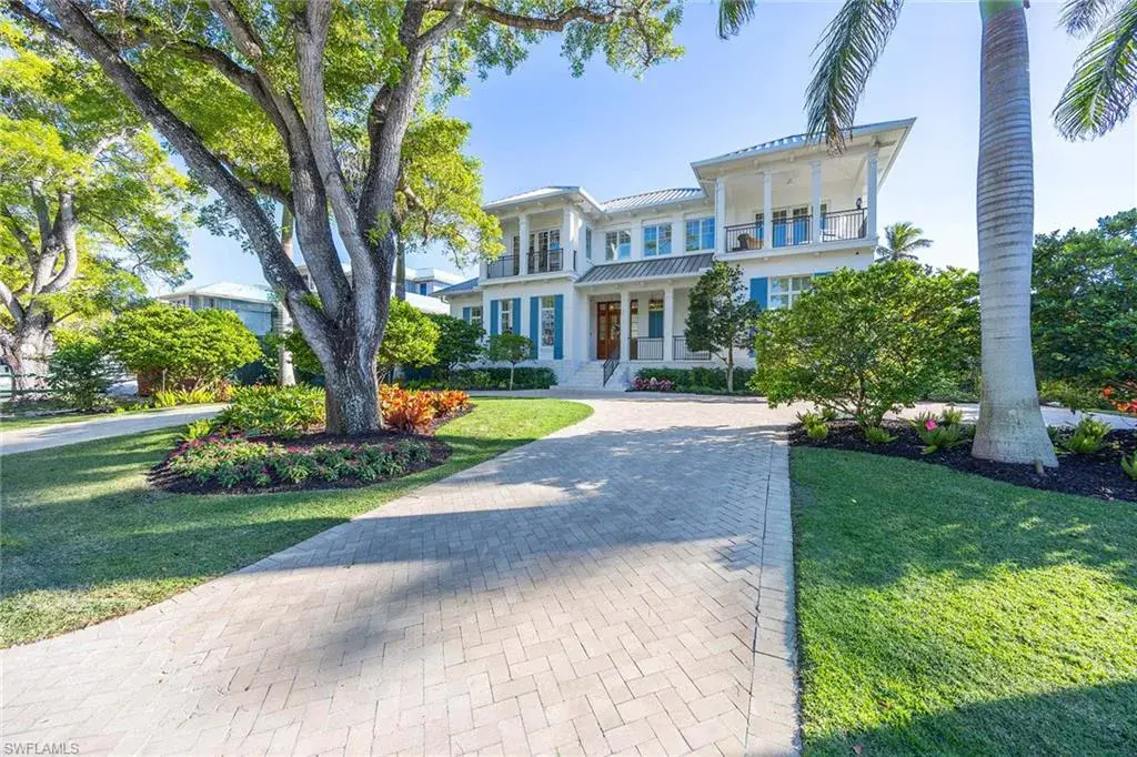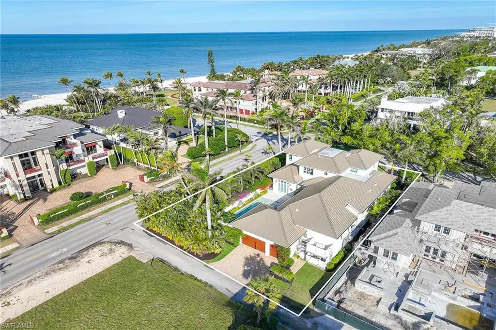 Just one home from the beach, this custom-built residence on a desirable corner lot at Gulf Shore Boulevard and 1st Avenue N blends elegance and superior craftsmanship with modern design. Created by Stofft Cooney and Big Island Builders in 2019, this home boasts exceptional finishes, including imported marble and wood flooring, intricate tilework and fixtures, custom impact doors and windows, and elevator. On an enchanting Mahogony tree-lined street and built for durability featuring two levels of concrete block construction, an elevated foundation, a custom metal roof and whole-house generator. The chef’s kitchen includes a Lacanche Volnay range, and Wolf and Sub-Zero appliances. The great room opens to a screened lanai with an Alfresco grill, overlooking a private pool and lush gardens framed by a tiled wall and mature landscaping. The first floor has a luxurious primary suite with an office, a large second bedroom with en suite, a library and an inviting family room. Upstairs offers two additional bedrooms with en suites, a lounge and bonus spaces. With southern exposure, outdoor living, gulf-view balconies and dog run, this home provides tranquility and privacy in a prized, Old Naples location. Resilient during hurricanes Ian and Milton, according to the owner, the house and pool deck had no water intrusion or loss of power.