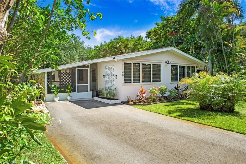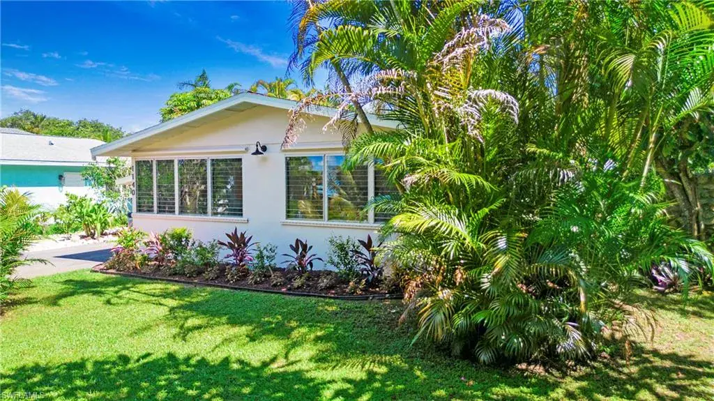 This Sun Terrace neighborhood sweet coastal cottage is nestled in the heart of Naples and only 1.25 miles to the beach and close to downtown. It is a tropical paradise that also maintains a mid-century flair. It is 3 bedroom and 2 baths which includes an en suite. There are no HOA fees and it is in Flood Zone X with no flood insurance required. A new roof was installed in 2019 and the AC installed in 2018. It offers an additional flex room bright with windows to allow the Florida sunshine in and for you to take in the lovely view. The flex room has many possible uses such as a potential family room, workout area, office or guest area. Possibilities for this home include your primary residence, vacation, seasonal, or investment use. This home is move in ready. Attention to detail was given throughout the entire home. Some additional major upgrades include Stainmaster waterproof luxury vinyl plank flooring throughout, all new appliances and the home is painted inside and out. Extensive upgrades abound including window blinds, lighting fixtures, fans, AC vents, door knobs and hinges. The bathrooms have new fixtures, faucets, and lighting. The all white kitchen has new butcher block countertops, and a new kitchen sink and faucet with inline water filter. New exterior features include an asphalt driveway with plenty of room for parking. A re-screened lanai, along with a new pool pump and well pump for the sprinkler system await you. Surrounding the back yard a unique stone wall affords privacy, and the spacious rear yard with a large deck next to the POOL is accented by lovely, mature trees and flora. The seller is also providing a credit at closing towards pool resurfacing. Please come by to see this home and make it yours!