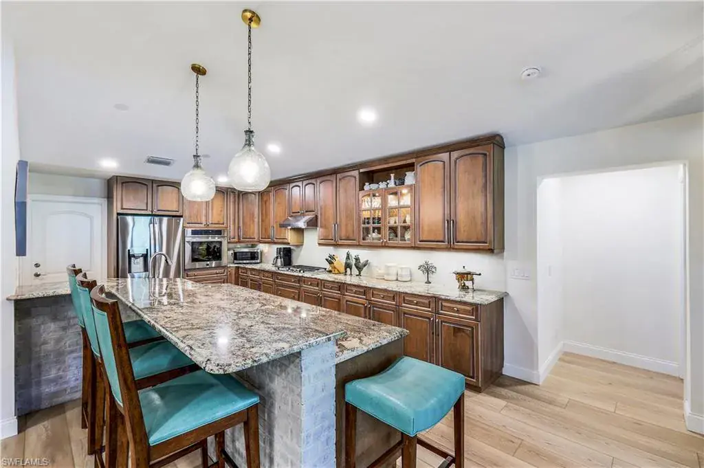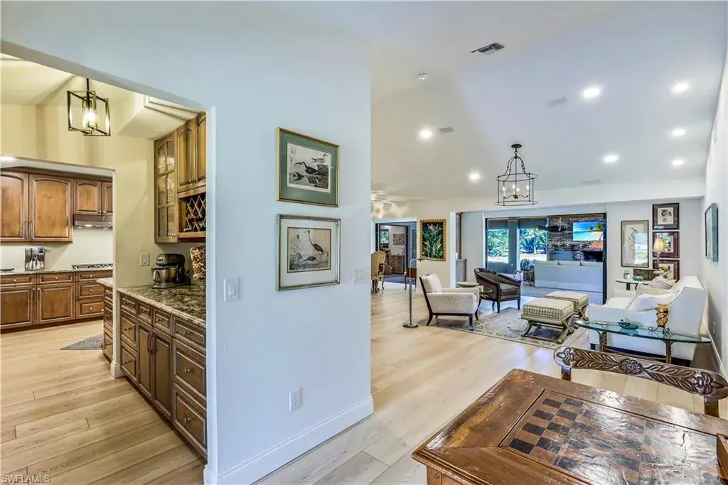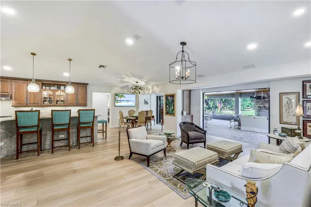 FOUR SEASONS = NO HOA’S, 1 ACRE HOME, HIGH & DRY, not in any FEMA flood zone! This serene location is one of the area’s best kept secrets. A North Naples estate property supporting a gorgeous recently renovated home toward the cul-de-sac end of a quiet street. The glass front doors & lit gallery walls lead to a sophisticated lounge style living room that flows through the telescoping sliding glass doors into an incredible 1,000 sq. ft. Florida room including a large masonry wood burning fireplace! And there’s so much more, a 40′ long new saltwater lap pool with a sun deck, bubbler fountain, and exotic tropical landscaping for just the right atmosphere. The open floor plan has a kitchen that is a chef’s dream with a gas stove, custom cabinetry, butler’s pantry & expansive counter space. The Living, Master and Dining-room doors open completely for a total free flowing experience! The split floor plan offers your family & guests 4 more bedrooms, 2 of which are spectacular suites, a rare find! Enjoy walking or bicycling on the wide streets in this tranquil neighborhood. This prime location offers both privacy & convenience, just 3 miles to the Gulf of Mexico, surrounded by world-class dining, upscale shopping, top-rated schools, and only 20 mins to RSW International Airport. This home would be an ideal choice for those seeking the ultimate Naples lifestyle!