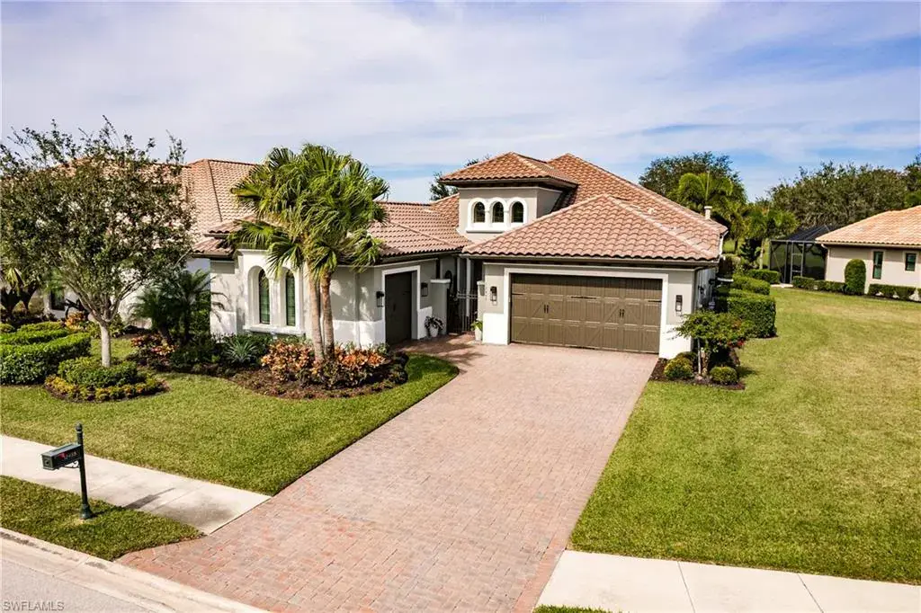FULL GOLF MEMBERSHIP INCLUDED WITH PURCHASE! This extraordinary residence has long golf & lake views and is located on an oversized lot. This home has 2,642 sq. ft. of living area featuring a great room floor plan with 2 bedrooms, den, 3 full baths, 3-car garage, and is sold partially furnished. Totaling 3,743 sq. ft., this home opens to a spacious outdoor living area with custom pool & spa with waterfall feature, separate seating areas, full outdoor kitchen, custom additional built-in cabinets, and picture window screens making it the perfect tropical paradise for any occasion. The kitchen has upgraded white cabinets with stainless-steel built-in appliances and is open to the great room creating a perfect setting for special gatherings. The residence is designed with luxury and modern style with numerous upgrades including tray ceilings, crown molding, custom lighting and fans, electric roll down shutters on complete rear and front, sound system, and security alarm. TwinEagles is a private 36-hole golf community and approved a $22,500,000 Clubhouse, Bocce, and Golf Course renovation that recently opened, creating one of the finest communities in Southwest Florida.