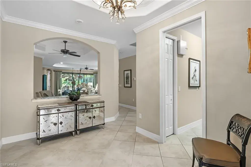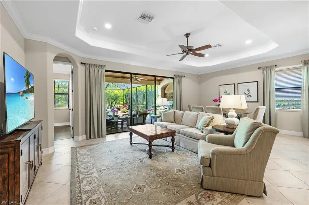 Luxury awaits you in this beautifully appointed three bedroom plus den two-bath pool home with full golf membership. The living room, dining and kitchen area provides an expansive open floor plan with 20″ porcelain tile on a diagonal that opens to the large extended lanai with the privacy of a natural preserve surrounding you complete with beautiful wood plank ceiling and outdoor kitchen. All bedrooms have been updated with luxury wood laminate flooring. The kitchen has beautiful 42″ wood cabinets with an antique finish with brown glaze detailing and granite counters tops stainless steel GE profile appliances and also new Air Conditioner in 2022. Twin Eagles has two award-winning 18-hole championship golf courses with a total of 614 members which allows for great access to the course for play. Twin Eagles offers a state-of-the-art fitness center with yoga, aerobics, tennis, pickleball and bocce and don’t forget the resort-style pool and spa and Tiki bar This is a must see before it’s gone!!