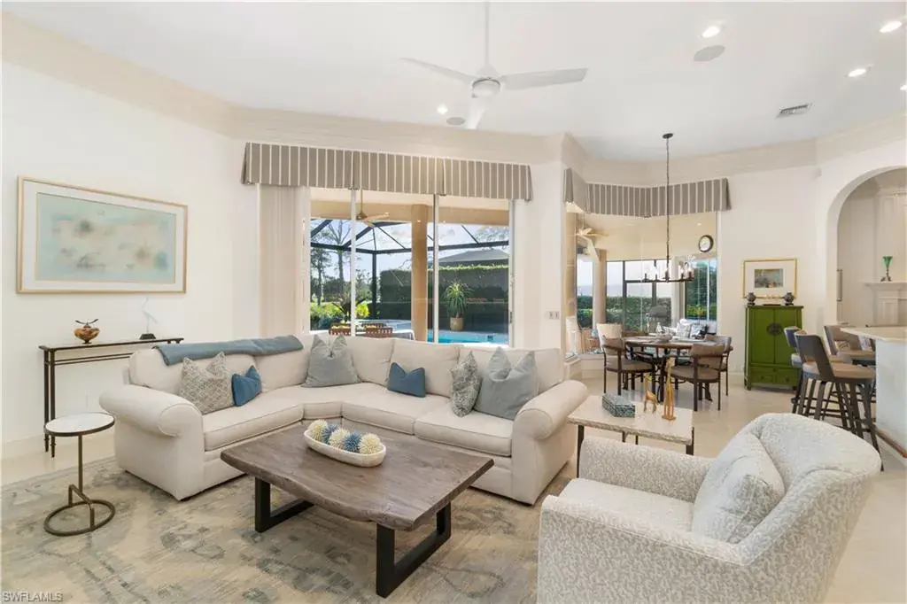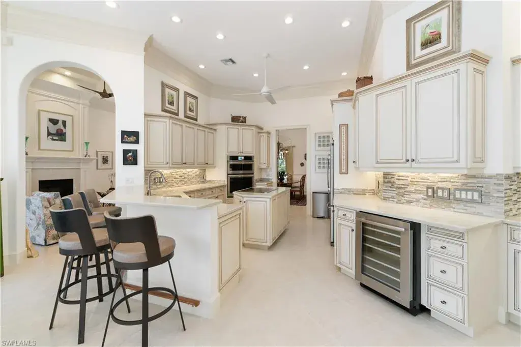 H9468   Beautifully renovated home with spectacular golf course views in North Naples’ coveted Audubon Golf & Country Club! Boasts prime Southern exposure for perfect sun on the pool/spa & unparalleled natural light. This immaculately maintained home is finely appointed with tile floors throughout, soaring high ceilings & Sonos surround sound system. Features a new roof in 2019, generator in 2022, automatic hurricane screens in 2020 & a newly redone outdoor pool deck with ample space & a picture-screen enclosure to highlight the golf course views. Gorgeous chef’s kitchen offers stainless-steel appliances, neutral-tone backsplash & an induction cooktop. Fantastic open & split bedroom floor plan with 3 bedrooms + den including spacious master suite with a spa-like en-suite bath. This oasis is lushly landscaped for ultimate privacy. Excellent location just a short golf cart ride to the club. North Naples’ “Audubon Country Club” is perfectly located 5-min from Mercato & SWFL’s world-class beaches, with gated/guarded entry, an 18-hole championship Golf Course, tennis, pickleball, Bayside boardwalk, newly renovated clubhouse with dining & 2nd brand-new spectacular poolside club/café.