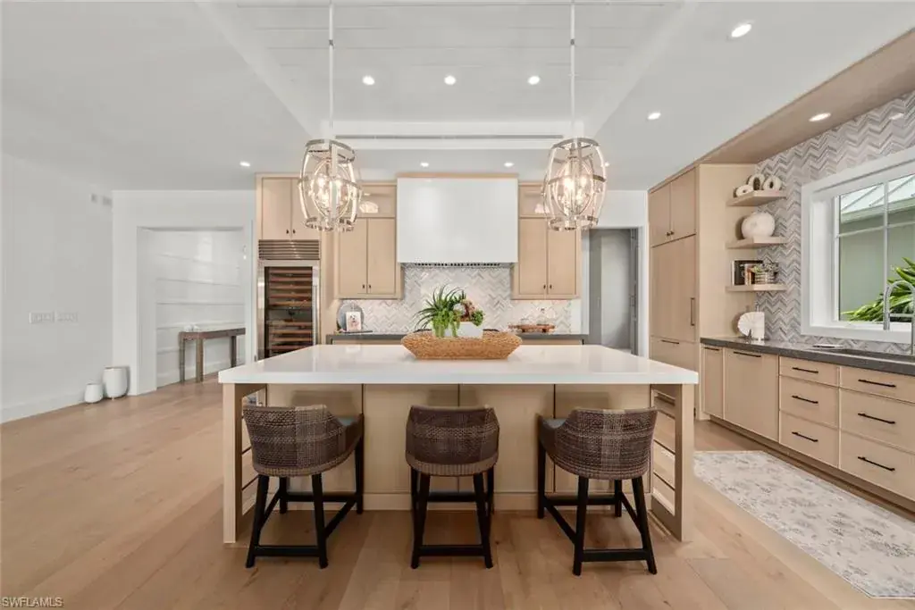 Situated in the sought-after Mangrove Bay neighborhood of Olde Naples, this coastal retreat captures the essence of refined waterfront living. The home offers just over 3,600 square feet of air-conditioned space on a generously sized, southern facing, waterfront lot. The thoughtfully designed Amelia III floor plan includes three en-suite bedrooms in the main residence, complemented by a detached guest suite above the garage—ideal for hosting family or friends. Interiors are elegantly finished with white oak flooring, vaulted tongue-and-groove ceilings, custom Ruffino cabinetry, and rich architectural millwork. The chef’s kitchen is outfitted with Wolf and Sub-Zero appliances, a 48-inch gas range, wine cooler, and a spacious walk-in pantry. Indoor spaces flow seamlessly to the outdoors, where a covered lanai features roll-down screens, a built-in grill, fireplace, and a saltwater pool and spa with a cascading wet wall—all designed for year-round enjoyment and entertaining. A private, deeded boat slip accommodates vessels up to 40 feet and offers a 20,000lb lift, providing direct access to the Gulf of Mexico. Additional upgrades include impact-rated windows and doors, a standing-seam metal roof, tankless water heater, generator, and advanced smart home systems. Located within walking distance to 5th Avenue South, Baker Park, the Gordon River Greenway, and the white-sand beaches of Naples, this residence offers both a vibrant lifestyle and peaceful privacy. The community includes luxury amenities such as a wellness center, concierge services, and a scenic waterfront setting. Meticulously designed and superbly located, this home represents a rare blend of timeless design and modern convenience in one of Naples’ most desirable waterfront settings.
