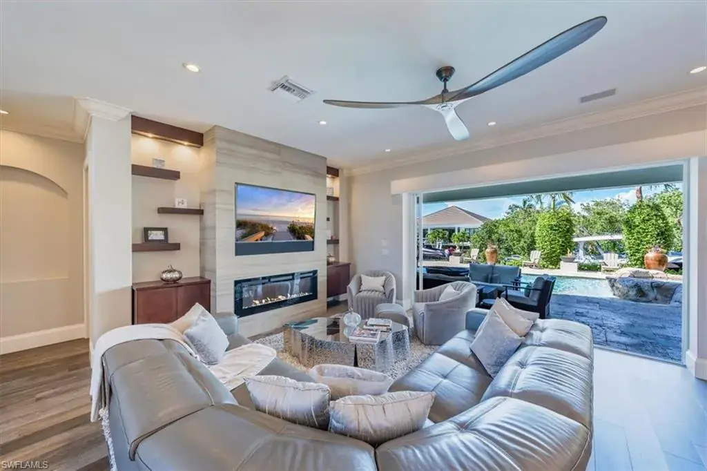 H11714 – Priceless….especially for the LARGE boat owner! This stunning waterfront home offers direct gulf access (NO BRIDGES!) and can accommodate up to a 48′ foot boat (including motors) on the custom lift installed in 2022 with a 30,000lb capacity. The Trex dock leads to an expansive pool deck with resort style pool & spa, an outdoor fireplace, and all season kitchen. With a fully remodeled kitchen & great room, custom bar, and an 8 person home theatre, it is the quintessential entertainment space. The main floor remodel included fresh neutral paint, designer light fixtures, Coretec flooring, a feature wall with gas fireplace and automated window coverings on the pocketing sliding doors. A CHEF’S KITCHEN with Quartz counters, dual islands and custom dining table is equipped with gourmet appliances including a Sub-Zero Refrigerator, GE Monogram induction cooktop and double wall ovens, built-in Miele coffee maker and a 250 bottle WINE CELLAR. The Main Floor OWNER’S SUITE is a sanctuary with an astounding spa bath, enormous closet and access to the pool deck. Upstairs, three additional bedrooms offer family and guests plenty of room for privacy and play.