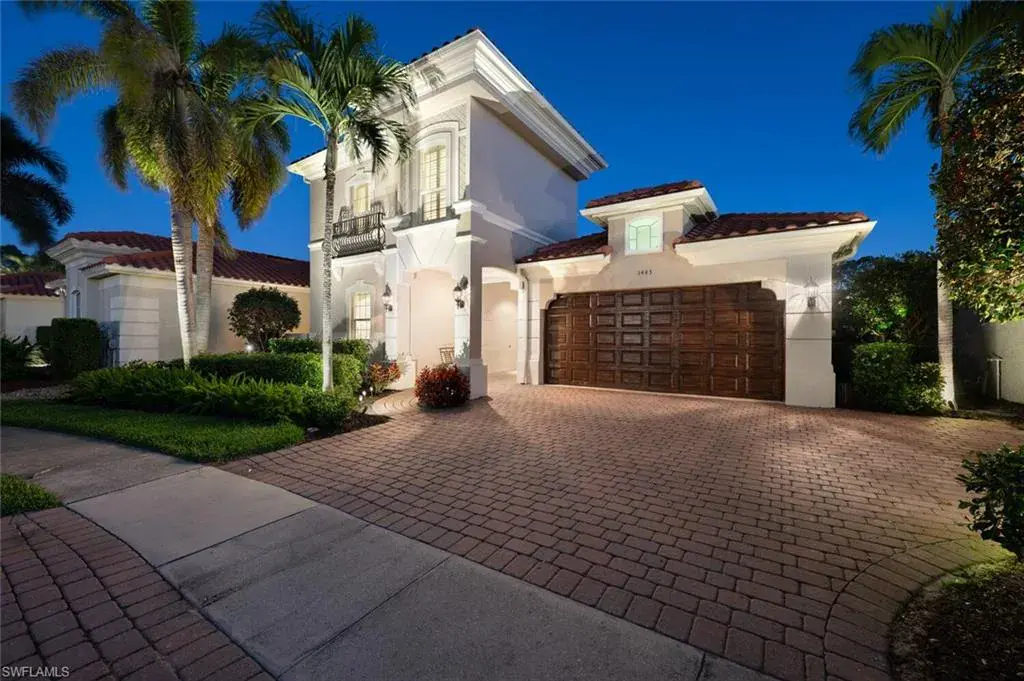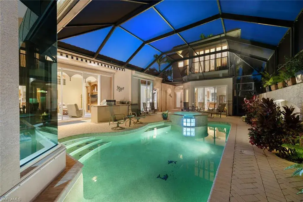 H8119 – WELCOME to the beautiful enclave of Portofino at Pelican Marsh. Portofino consists of 43 single family villas, nestled between 2 par three holes of the Pelican Marsh Golf Club. The main entrance of the property, places you in the private enclosed courtyard with your pool, spa and outdoor kitchen, and retractable sun shade. To access the main house, there is the grand foyer or the large sliding doors to the family room and kitchen. The large kitchen is a cook’s paradise with SubZero appliances including an electric/gas/steam cooktop, double ovens, built-in refrigerator, under counter refrigerator, wine chiller, trash compactor, and more. Abundant cabinets throughout. There is a screened lanai and open patio, off the main living room with a spectacular view of the golf course. Also, accessed from the courtyard is the 970 sqft guest house, consisting of 2 stories, 1 bedroom, 2 full bathrooms, and a morning kitchen. Guest house has a sitting area, that doubles as a bedroom with a pullout sofa and privacy door. Plantation shutters and shades throughout. Hurricane protection.