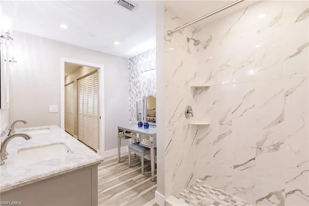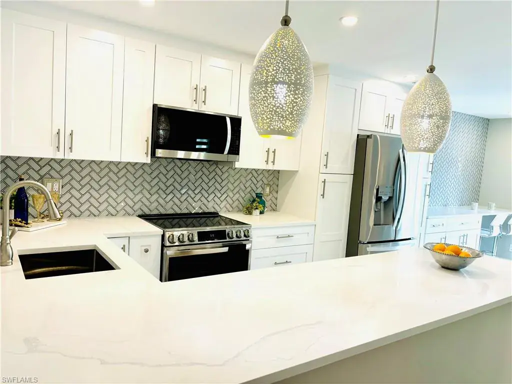 Dazzling coastal gem with modern designer finishes, perfectly poised in an ideal location, just a mile+ to downtown 5th Ave.! Exquisitely and newly rebuilt from floor to ceiling in 2023. Stylish accents include; all tile flooring throughout, full wall backsplash, marble style kitchen counters, white cabinetry, spa-like showers, custom wall-to-wall closet in primary bedroom. Nearby is fine dining, shopping, dancing, luxury resorts, Naples famed white sand beaches! Just a short stroll or scenic bike ride to the marina, Tin City, Bayfront restaurants or multiple parks. Beach lovers will revel in the coastal lifestyle with year-round Florida sunshine and breathtaking sunsets. Boaters will have direct access to the Gulf from your boat dock included. Investors, opportunity knocks in this coveted 34102 sweet spot. Single story, desirable open concept floor plan with breakfast bar. Laundry area contains full size washer and dryer. 2 assigned parking spaces. New appliances. New impact resistant windows. Slider door from main area leads to the private patio for tranquil living whether outdoors or in. Revel in the quintessential Naples lifestyle that many dream of, and don’t miss this unique property which has it all!