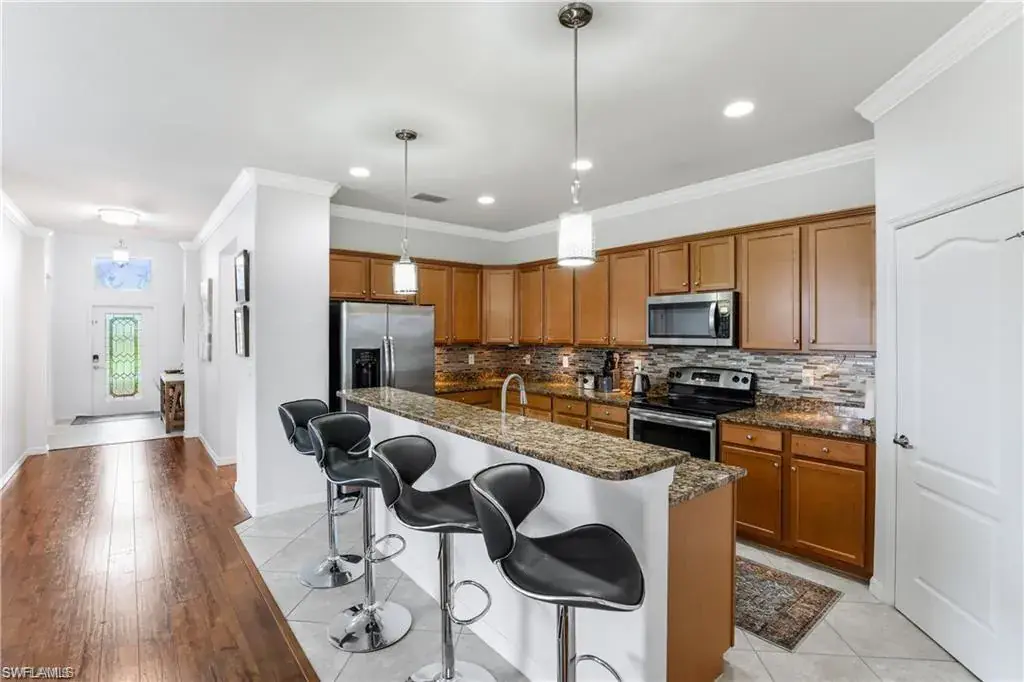 Welcome home to Reflection Lakes of Naples. This home boasts 4 bedrooms, 3 full bathrooms and a 2 car garage. The kitchen, complete with an island, features wood cabinetry, accompanying granite countertops and stainless steel appliances. Enjoy lake views from right from your living room and the oversized lot has plenty of room for a pool! Reflection lakes amenities include a clubhouse, billiards room, fitness center, and large community pool with a separate children’s pool. Low HOA & No CDD. Ideally located within close proximity to 5th Avenue, SWFL’s beautiful beaches and Marco Island!