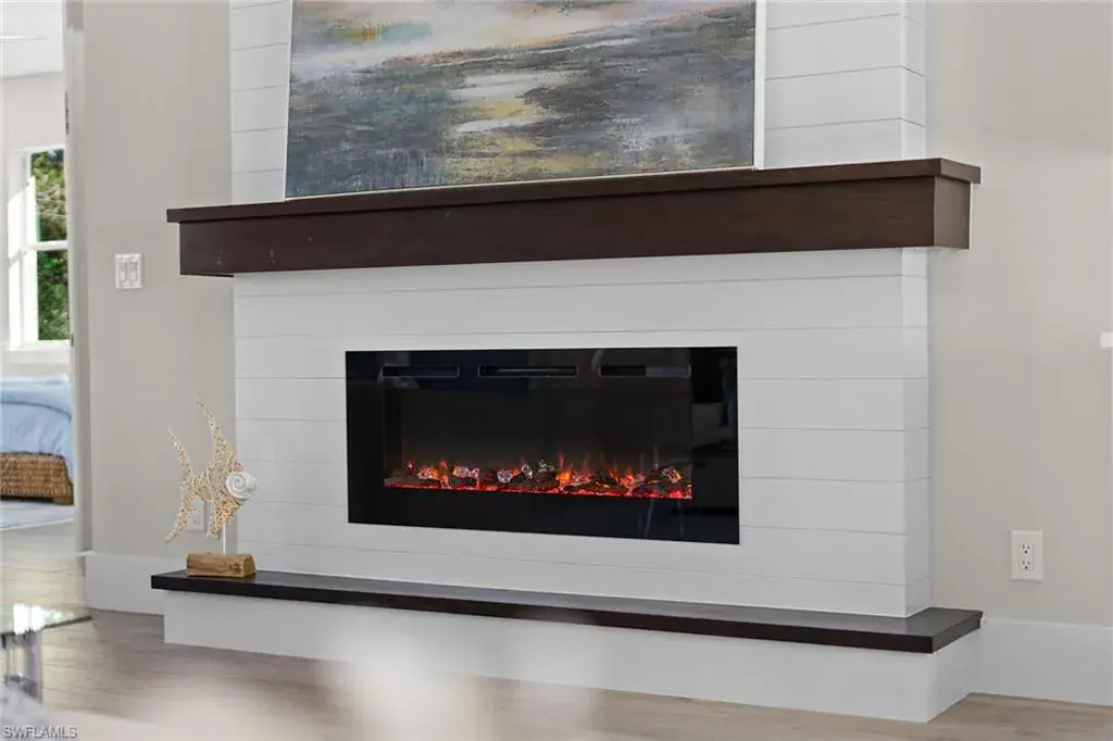 A bespoke shiplap fireplace wall anchors the living room, complementing the sleek quartz-clad chef’s kitchen with professional-grade Viking appliances. The privately positioned primary suite captures lake views and boasts dual walk-in dressing rooms and a spa-inspired bath with a freestanding soaking tub and oversized shower.