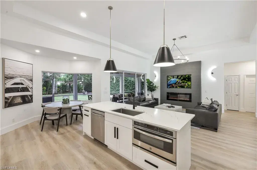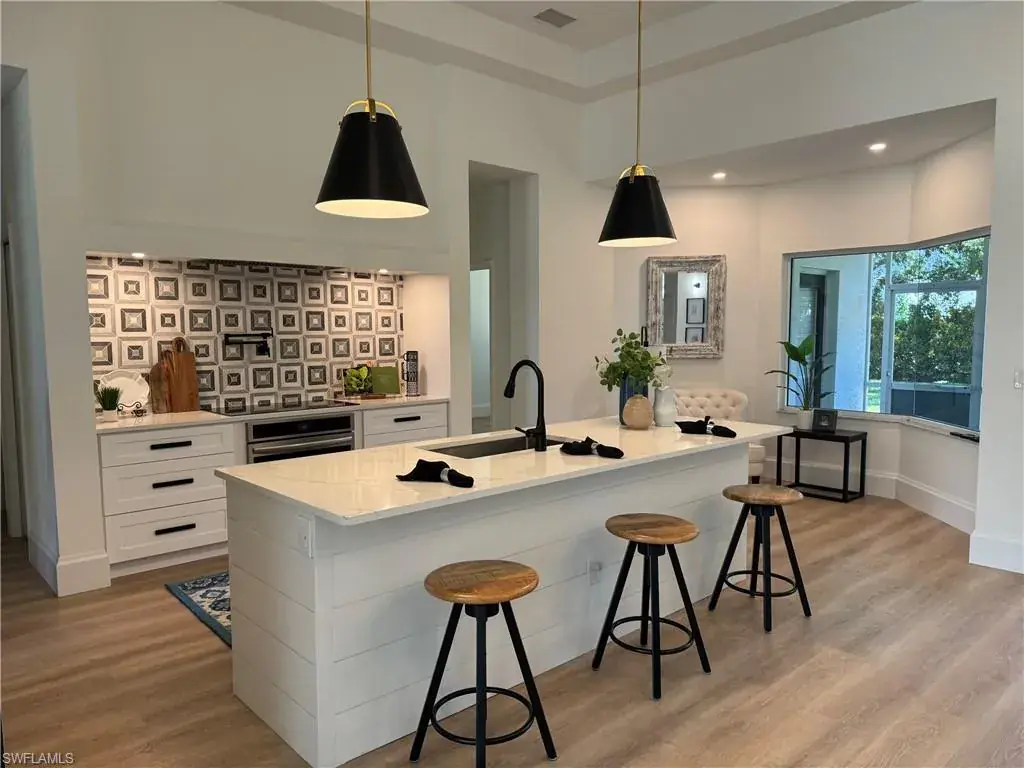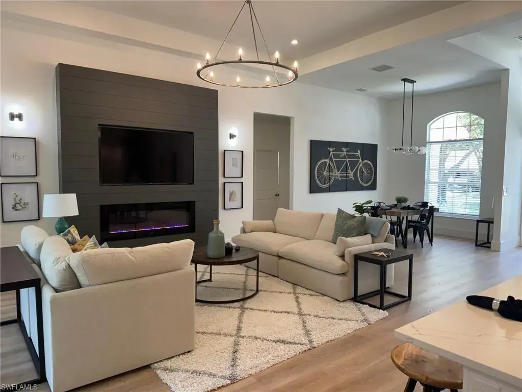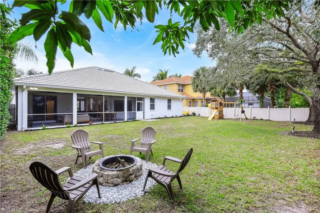 SELLER RELOCATION = OUTSTANDING OPPORTUNITY! An entertainer’s dream, this sophisticated 3+Den, 2 Bath home features numerous updates that today’s buyers are looking for. Step inside & be greeted by premium finishes, custom wall treatments & high-end light fixtures. This open great room floor plan offers a large center island kitchen with crisp white shaker cabinetry, quartz countertops, induction cooktop, vented range hood and even a pot-filler! The sunny, light filled home has 12’ ceilings, numerous windows & European white oak LVP flooring with 8” baseboards throughout. (No carpet here!) The great room features a custom wall with LED fireplace & built in TV. Enter the primary suite through double doors to find a generous bedroom with lighted tray ceiling, large walk-in closet, bath with jetted tub and oversized shower with dual shower heads. A den with custom wall treatment and two generous bedrooms complete this home. Outside, you’ll find a large, screened lanai with recessed ceiling lighting. An oversized backyard with sunny SOUTHERN exposure makes this a great place for year-round family fun. There is plenty of room to add a pool/spa. There’s also a perfect tree for a tree house! No buildings directly behind the property offers total PRIVACY! Don’t miss the oversized garage with epoxy floor & second refrigerator. AND this home has a NEW RUUD HVAC SYSTEM (March 2024) and a ROOF CERTIFICATION (May 2024). Indigo Lakes is a private gated friendly community of 397 single family homes located in North Naples and is walking distance to Oakridge Middle School! Amenities include clubhouse, resort-style pool, spa, fitness center, basketball, tennis courts and playground, all with low HOA fees of just $325/month! PRICED BELOW APPRAISED VALUE