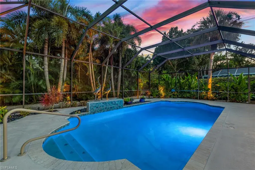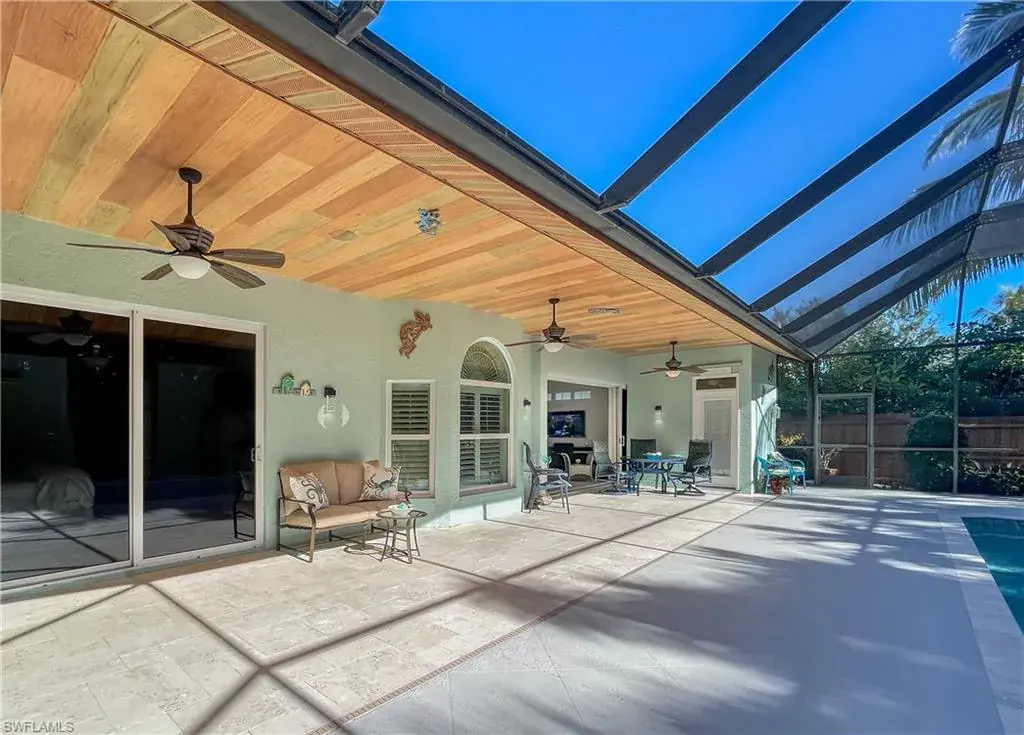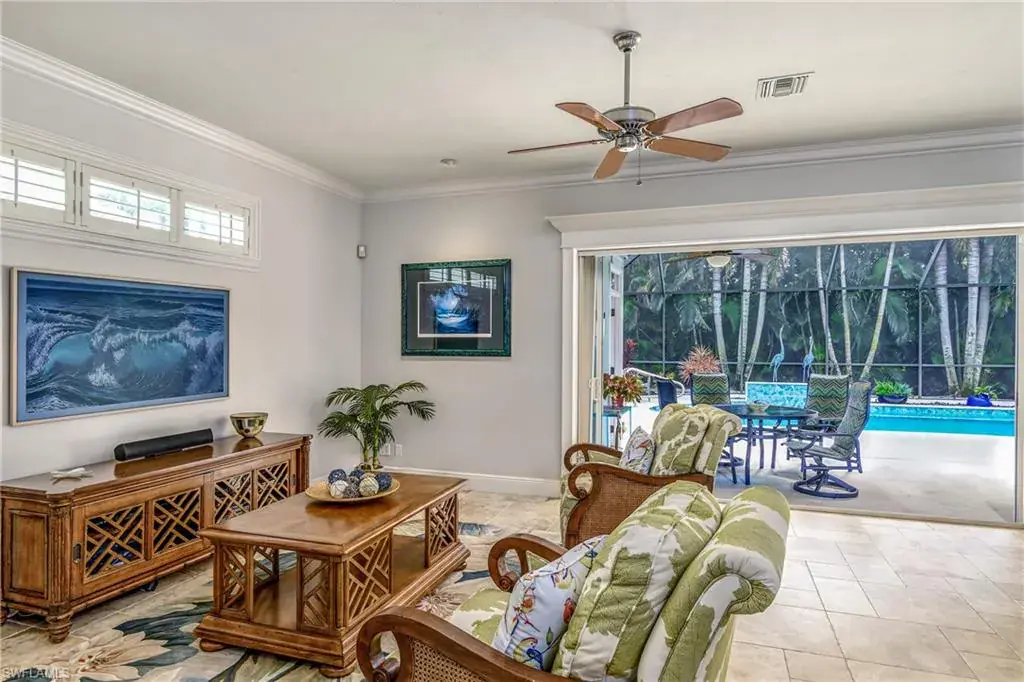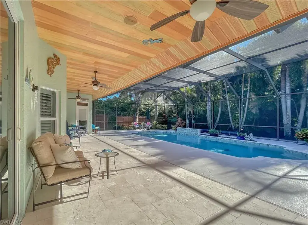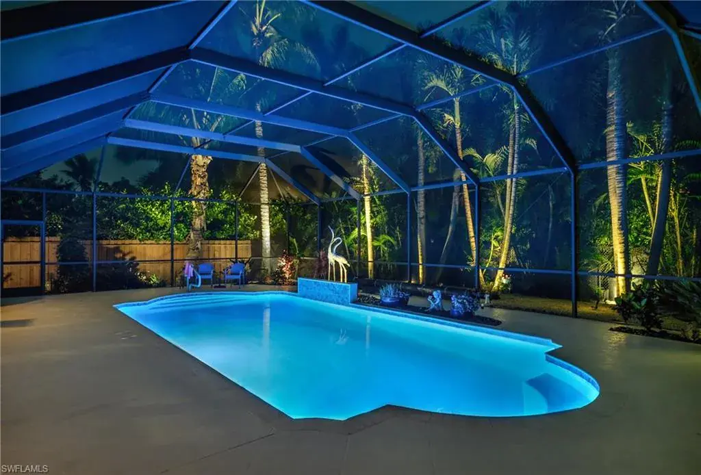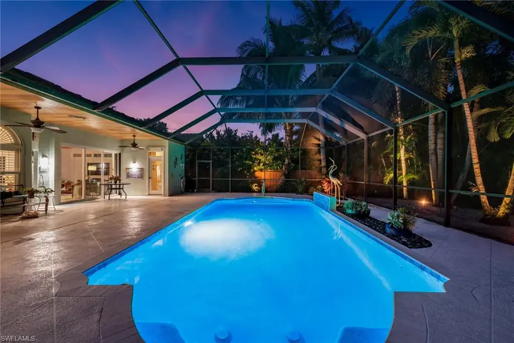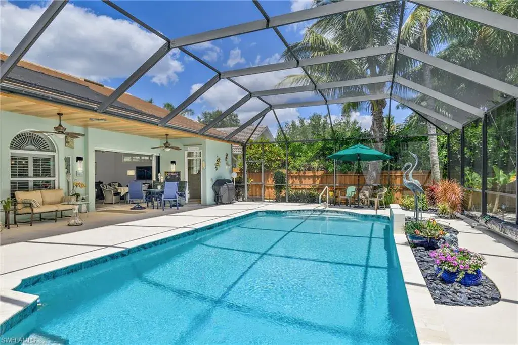LOCATION! Just reduced $75K Bike to Seagate beach or Waterside Shops, Royal Poinciana CC or CC of Naples from this charming residence, minutes to Venetian Village, Mercato or Old Naples! Built for entertaining your family and friends with wide open floorplan, this residence lives large, open and bright with 10′ ceilings! Radiating an upscale Key West ambiance with Ashlar-pattern Italian porcelain tile, code windows and doors, plantation shutters and 6.5″ base and crown moldings. Pocket sliding doors hide to access a private expansive pool deck with a 36′ long caged saltwater lap pool, electric and solar heat and a Solar winter blanket, ensuring year-round enjoyment. Fenced on two sides, you are surrounded palm & flowering fruit trees with night time landscaping lighting. The expansive 41′ covered lanai features faux wood ceilings and lush landscaping. The pool and deck were upgraded in Feb ’24 with a new Pentair light system, re-surfacing, waterline tile, and coping. The huge kitchen is a gourmet chef’s dream! Gas and electric ranges, Subzero Refrigerator, Wine cooler, Bosch DW & Monogram double ovens. Two breakfast bars have granite/quartz counters. With charming cottage curb appeal, this residence lives larger than the square footage shows, nestled in an enclave of 52 single-family homes offering a community pool and tennis, excellent schools, meandering streets and sidewalks, ponds, and low fees. Other features include a Brick paver driveway, a newer roof 2019, AC 2021, a monitored alarm system, a professional lighting system for art, new pool screens and a high-end surround sound system. Bedroom 2 has a custom built-in office space, a queen-size Murphy system & tons of storage with custom closets throughout. New Pool screens and no storm damage or flooding. Engineered wood floors in kitchen and BR #3. Home inspections completed and available upon request. Don’t let the small square footage fool you! Seeing is believing especially at night!