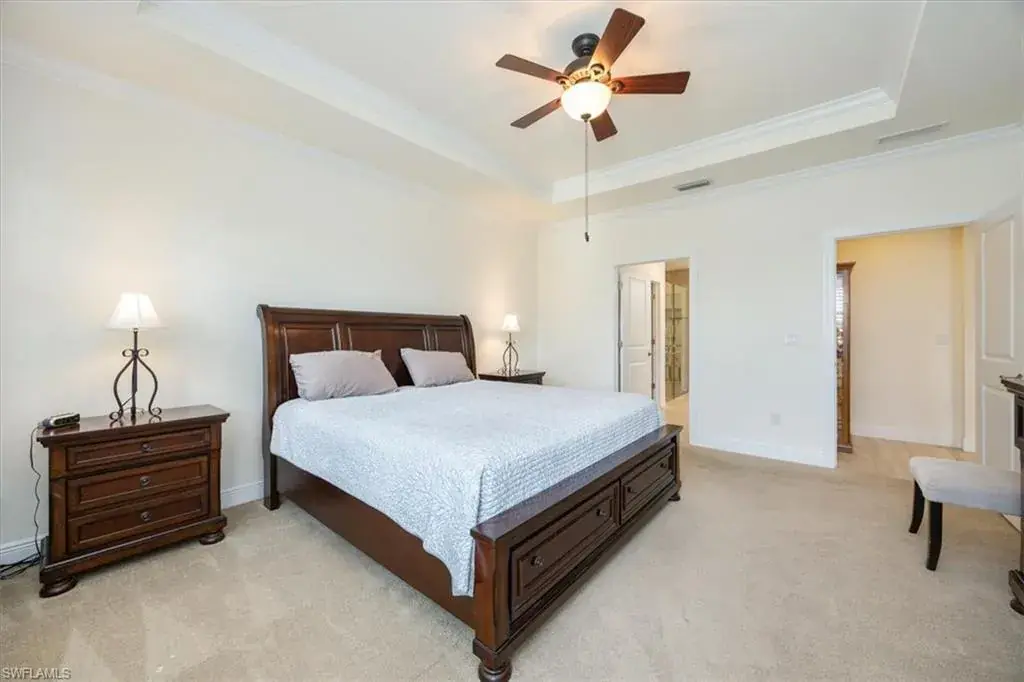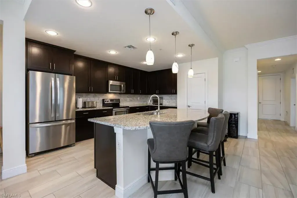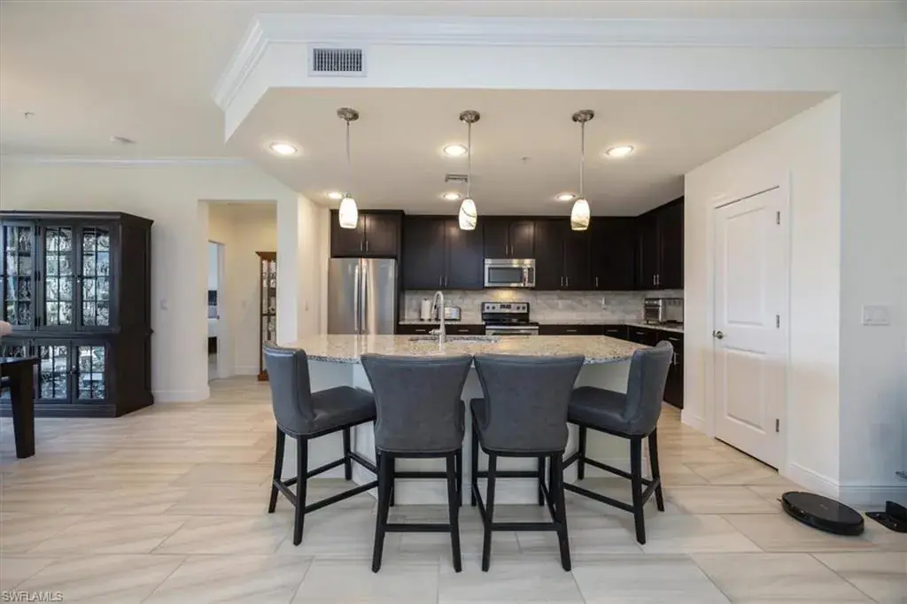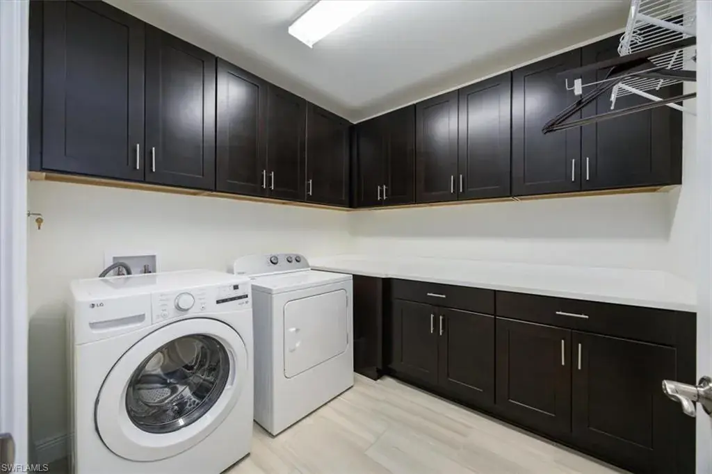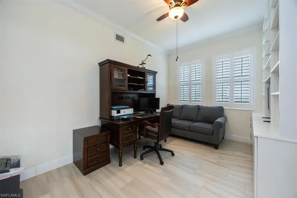 Experience elevated living in North Naples! Step into a lifestyle of comfort and convenience with this captivating 1800+ sq ft first floor condominium. Boasting 2 bedrooms, a den and 2 bathrooms, — plus a large walk-in storage room with built in shelving. Den has the same built-in shelves as the storage room. Spacious laundry room with beautiful wood cabinetry (that matches the kitchen) for even more storage. This home welcomes you with its neutral palette and refined finishes. The kitchen is a true highlight, featuring rich wood cabinets, large island, elegant granite countertops, and modern stainless steel appliances. Plenty of separation between the master bedroom and guest bedroom. Relax and entertain in the spacious great room, bathed in natural light, with sliding glass doors opening to your private lanai overlooking Butler Lake. You’ll appreciate the added benefits of impact windows and doors and a location not in a flood zone, all complemented by a two-car attached garage. Livingston Lakes, a pet-friendly, gated community nestled in the heart of North Naples, offers the ease of condominium living with resort-style amenities. With only 230 homes, this charming neighborhood provides a sense of intimacy and community. Enjoy a sparkling pool with lap lanes and cabanas, two convenient built-in gas grills, a stylish clubhouse with a catering kitchen, a state-of-the-art fitness center, and a cozy outdoor fireplace and fountain—all with remarkably low fees! Your new home is just steps away from North Collier Regional Park, offering miles of scenic nature trails, premier sports facilities, a thrilling water park, and Golisano Children’s Museum. Plus, you’re less than five miles from the breathtaking white sand beaches of the Gulf. With endless shopping and dining options, and convenient access to I-75 and multiple international airports, Livingston Lakes is truly the perfect place to call home, whether year-round or for frequent, cherished visits.
