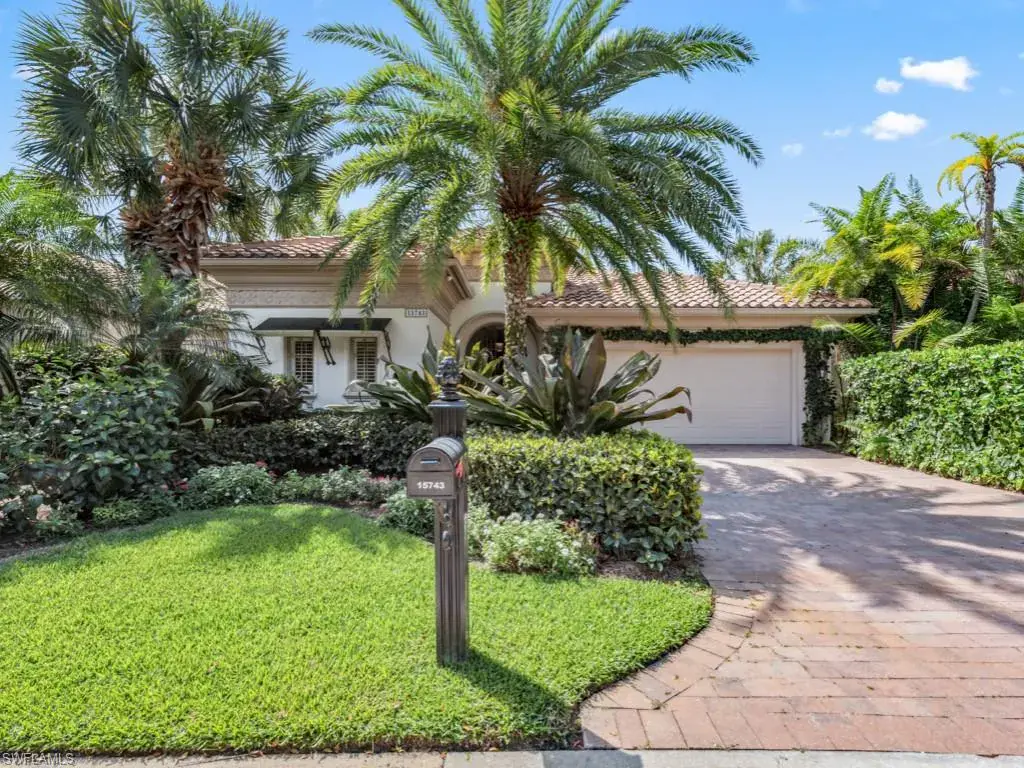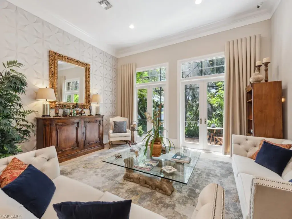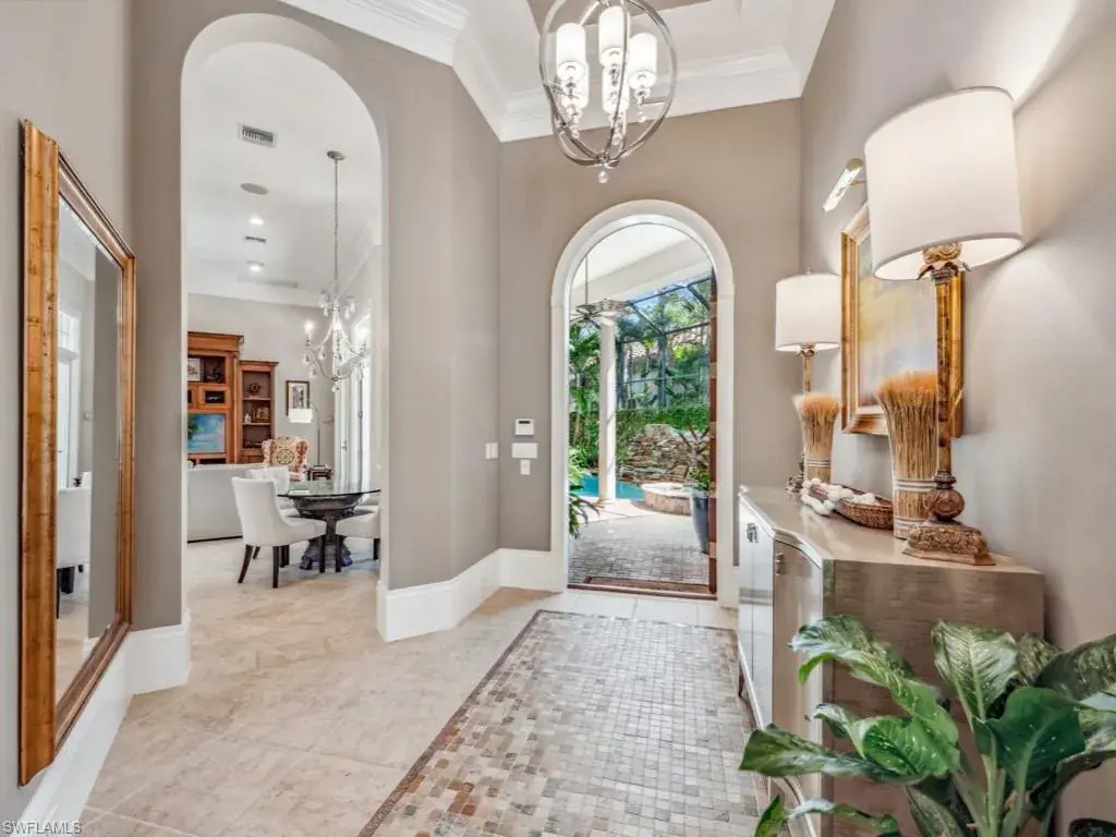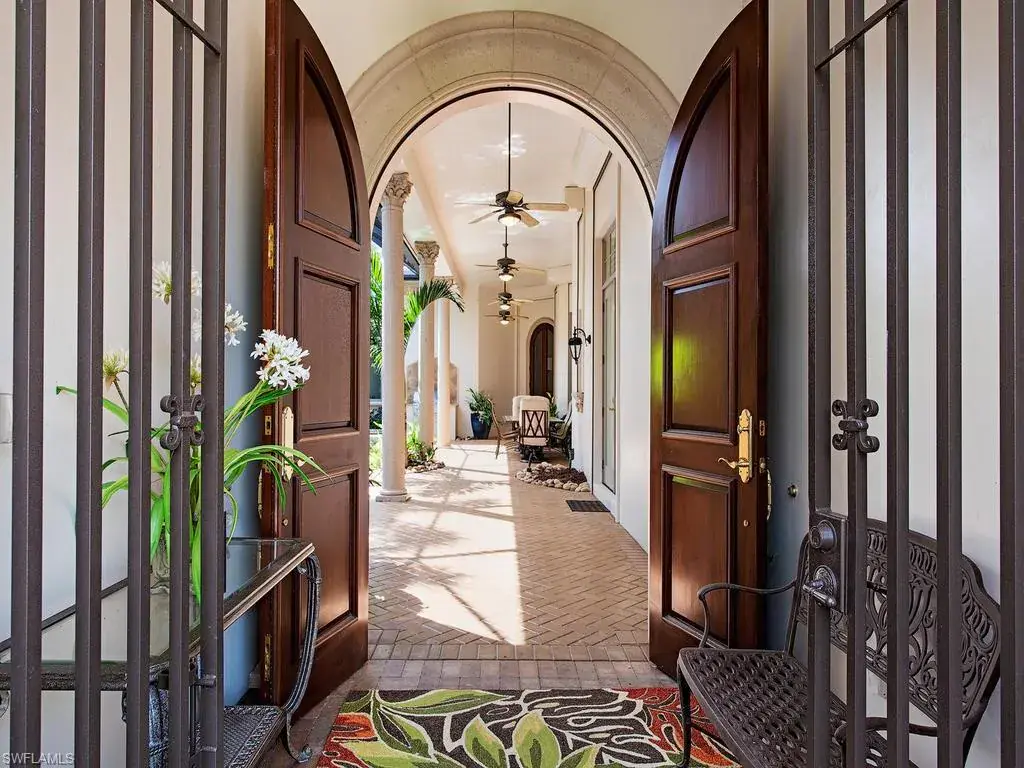 Located in the beautiful Mediterra Country Club – NEWLY RENOVATED PRIVATE BEACH CLUB – Enter this opulent COURTYARD POOL HOME boasting an abundance of custom appointments found throughout, including volume ceilings, wide crown moldings, arched passageways, French doors, plantation shutters and gorgeous tile flooring laid on the diagonal with mosaic details. Top-of-the-line appliances, rich wood cabinetry, granite countertops & a tumbled stone backsplash are found in the gourmet kitchen. A wall of French doors in the comfortable family room open to the screened pool courtyard, adding more depth to this spacious floor plan. Retreat to the master suite featuring volume tray ceilings, recessed lighting & direct outdoor access to a private screened lakeside patio. A delightful guest cabana featuring a morning coffee bar & private bath. Enjoy outdoor living in the expansive screened courtyard featuring a lagoon shaped pool with rock waterfall features & a spillover spa, surrounded by tropical landscaping creating the feeling of a private oasis. Mediterra is a prestigious luxury golf & country club community featuring Two championship Tom-Fazio golf courses for avid golfers, a private beach club with restaurant & bar, multiple tennis courts, pickle-ball & bocce, fitness center, pristine bike & jogging trails, and luxurious dining at the private country club restaurant. The Mediterra Beach Club offers an escape to a 10,000 sq. ft two-story private oceanfront paradise on the Gulf of Mexico. Featuring a restaurant & bar that serves members via indoor & outdoor dining, this private facility boasts a heated swimming pool, a sundeck, and cabana beach service for chairs, umbrellas & refreshments. *INCLUDES WHOLE HOME GENERATOR & A/C Garage.*