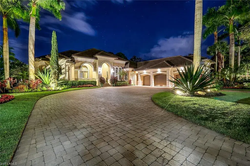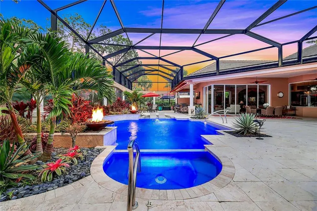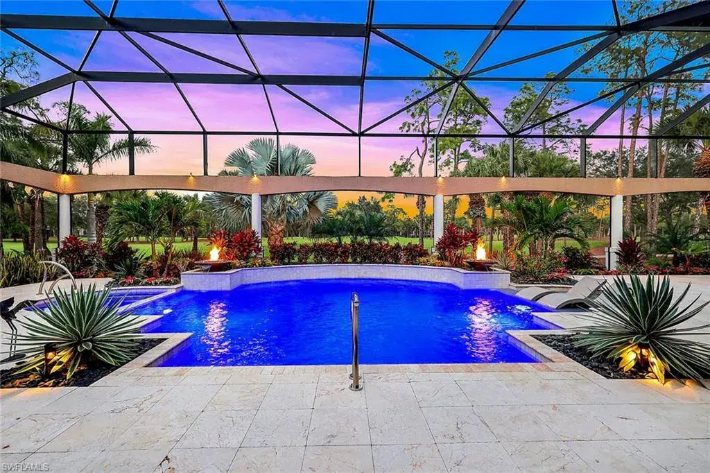 H12506 GOLF MEMBERSHIP AVAILABLE IF CLOSED BY THE END OF 2023! Double mahogany front entry doors welcome you to this four bedroom plus den, four full and one-half bath updated exquisite estate home in Savona of Mediterra. Elegant architectural and designer details found throughout include volume ceilings with crown moldings, updated kitchen with new granite countertops, a wet bar with custom cabinetry, wine cooler with refrigerator, upgraded appliances, and beautiful marble and tile flooring throughout. Large impact glass sliding doors in the family room completely open to an expansive updated screened lanai outdoor living area, making a seamless transition from indoor to outdoor living. The lanai boasts a new outdoor kitchen, covered seating areas, a beautifully updated sparkling pool with two fire & water bowls and spill over spa. Enjoy tropical living at its best with gorgeous, updated landscaping that surrounds the pool and entire grounds area. An outdoor gas fireplace adorned with natural tumbled stone is an exceptional focal point, with outstanding double fairway golf course views as the perfect backdrop.