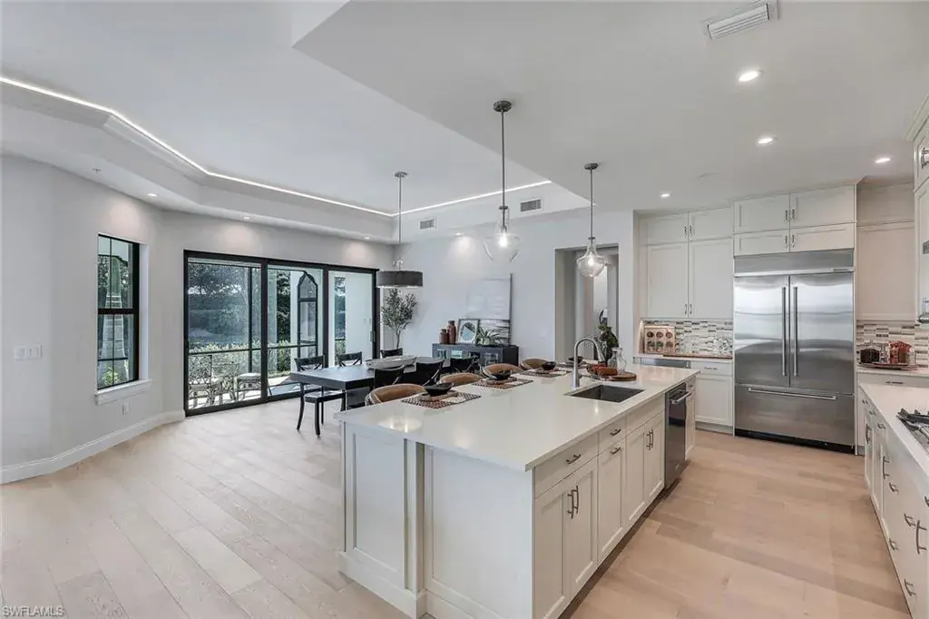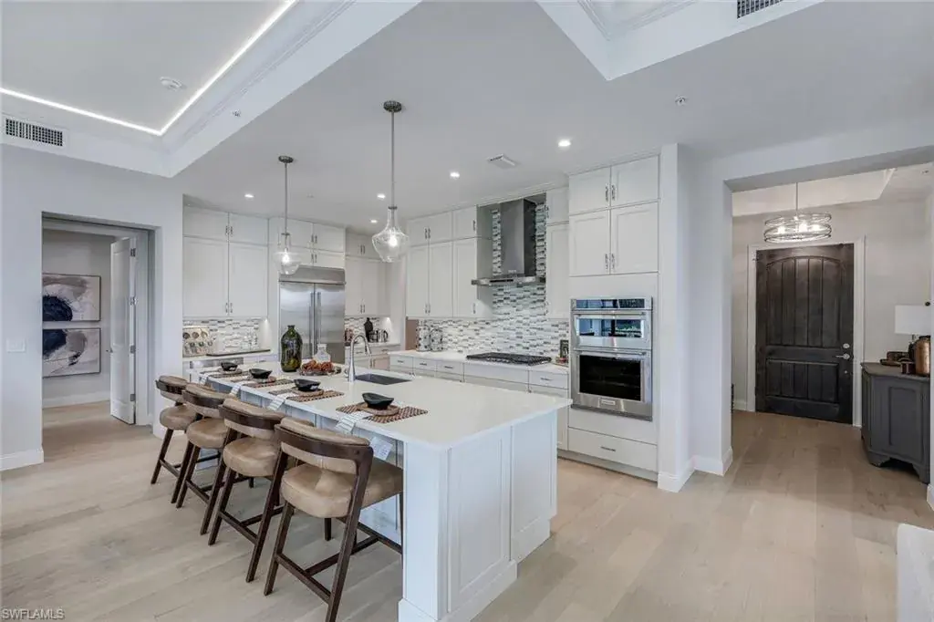 Indulge in the epitome of luxury living with this meticulously crafted, brand-new coach home in Talis Park, a North Naples gated golf community. A 1st floor unit with volume ceilings is light and bright with an open floorplan. The home was meticulously crafted and features luxury upgrades including engineered hardwood floors and tile, custom lighting and smooth wall finish throughout. Unlike other Corsica units, it has an additional Den for your home office and is wired for High-Speed Internet. A CHEF’s DREAM KITCHEN with KitchenAid appliances including a NATURAL GAS stove. Quartz countertops, cabinets with soft-closed doors & drawers and large kitchen island ideal for entertaining. The lanai’s OUTDOOR KITCHEN and GAS GRILL overlook a serene lake and offers plenty of privacy. The attached 2-car garage has epoxy flooring & extra storage. Best of all, you can lock it and leave the unit and all the exterior maintenance is included. Talis Park is an amenity rich community with multiple dining options, clubhouse, 18-hole golf course, Har-Tru tennis courts, Pickleball, Bocce, fitness center, full-service spa, dog park, walking trails & private beach shuttle to Vanderbilt Beach.