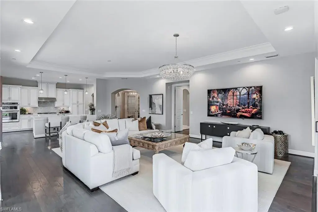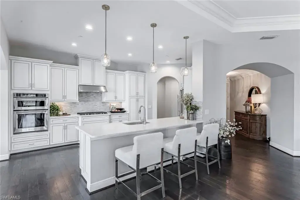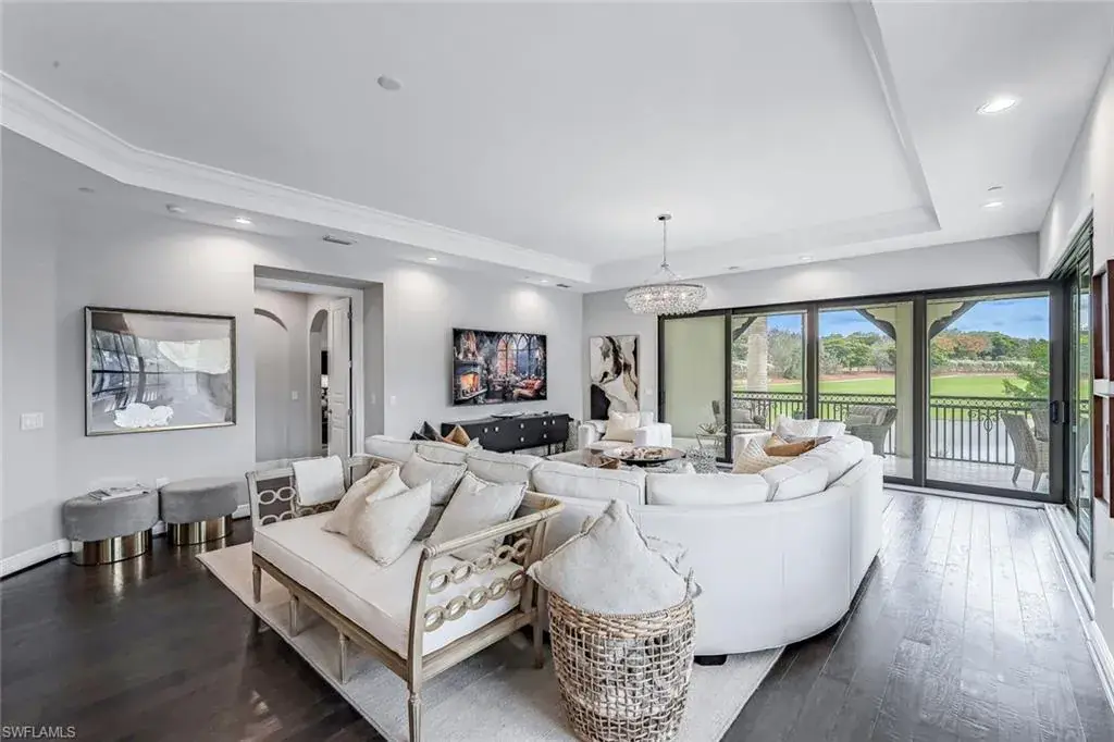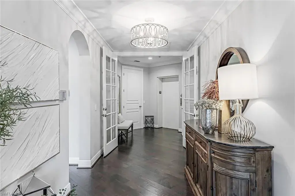 Well appointed “Penthouse” condo with sweeping golf course, lake and rock bridge views from hole 1 outside your wrap around loggia area and primary bedroom. These units live like a single-family home with 2,950 square feet under air, 3 beds + den and 3 & 1/2 baths. Modern organic interior with rich neutral palate. Upgrades include quartz countertops, new LED recessed lights and fans, hard wood floors, primary closet build out, automatic hurricane screens, plantation shutter window treatments. Dry bar with wine and beverage cooler. Natural gas cooking range. Conveniently located within walking distance to the mailboxes, Carrara private pool, spa, grill area, driving range, and Casa Cortese. Two assigned parking spots on ground floor with additional private storage space with dehumidifier. Club House (voted Clubhouse of the year 2016 by Golf Inc. Magazine!) “Vyne House” offers Core Fitness Center & Esprit Spa plus Fiona’s Market Café! The recently renovated golf course was designed by Greg Norman and Pete Dye and is ranked by Golf Digest as one of Florida’s top 20 courses. Tennis and recently added Pickleball courts!