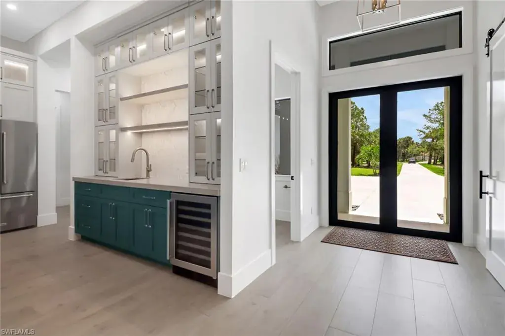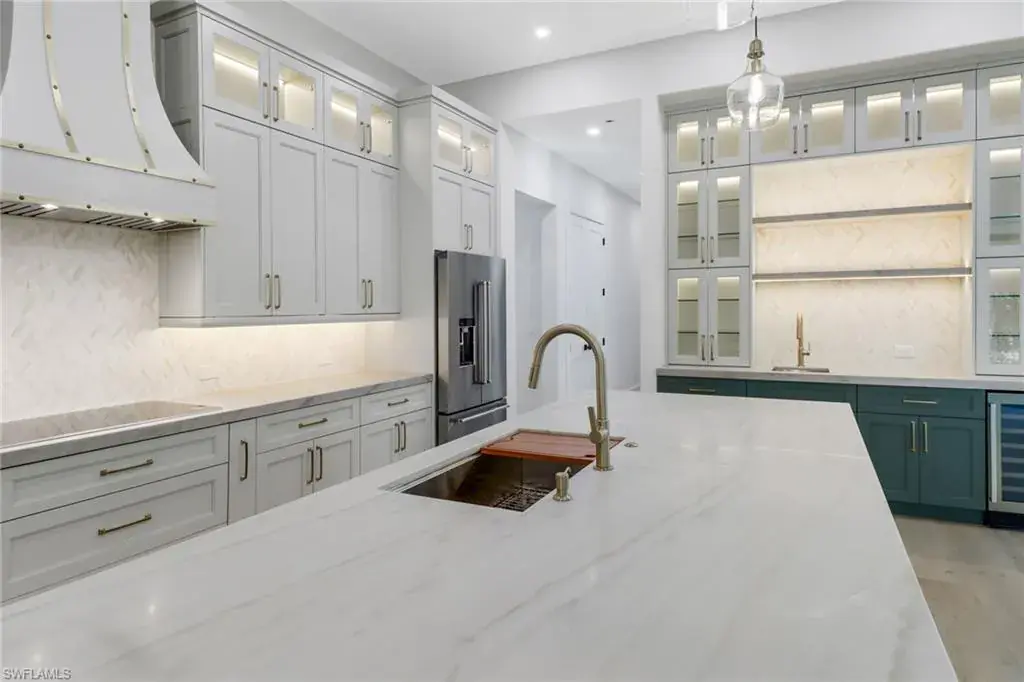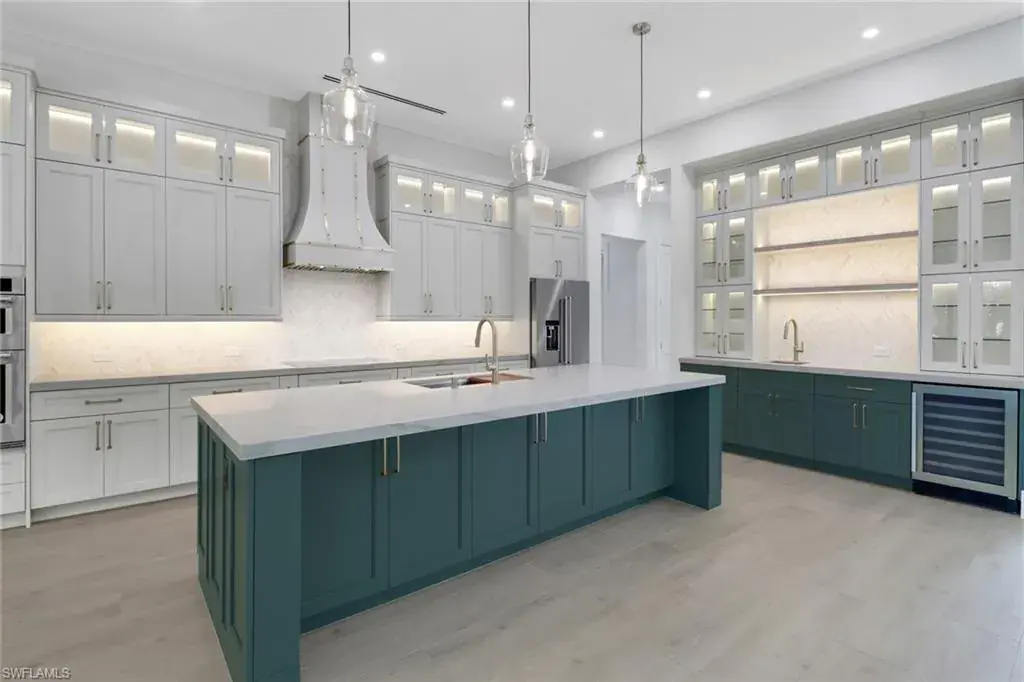 The large kitchen is a chef’s delight, showcasing an oversized island, quartzite countertops, painted wood cabinetry, Kitchenaid stainless steel appliances, and a wet bar with a wine fridge.