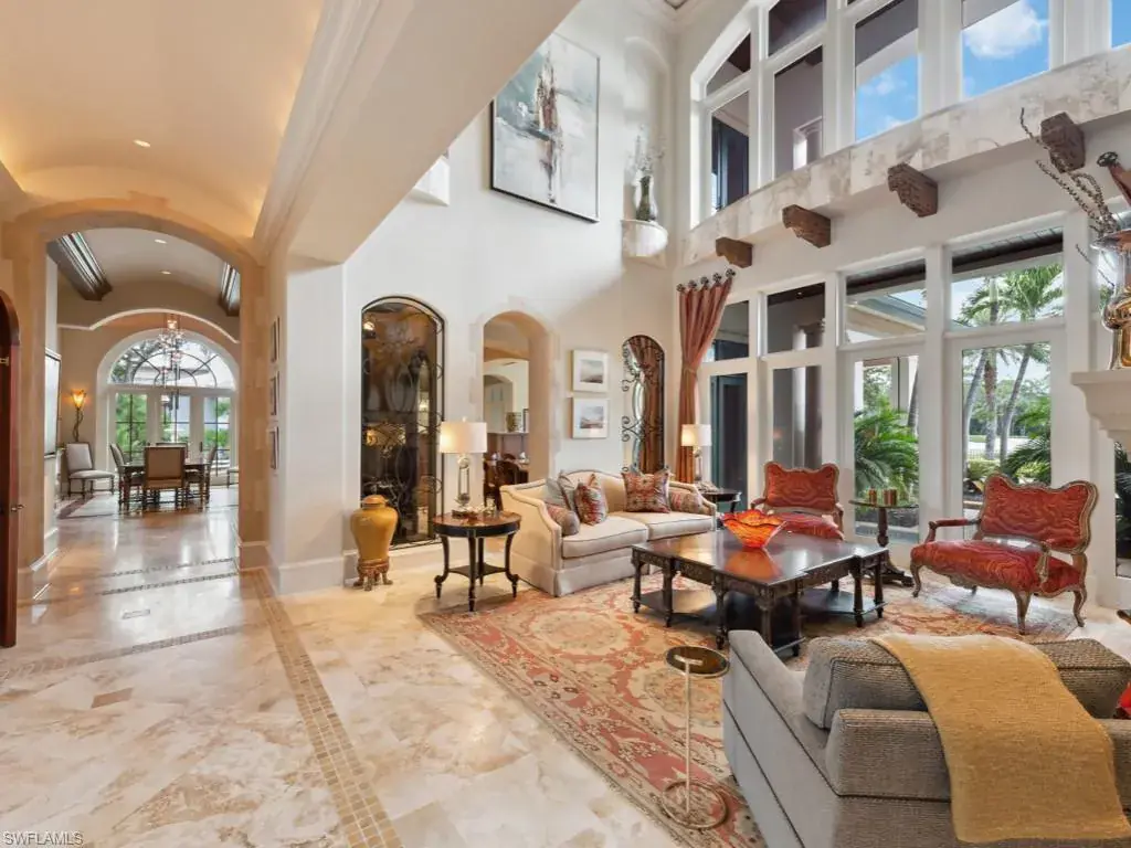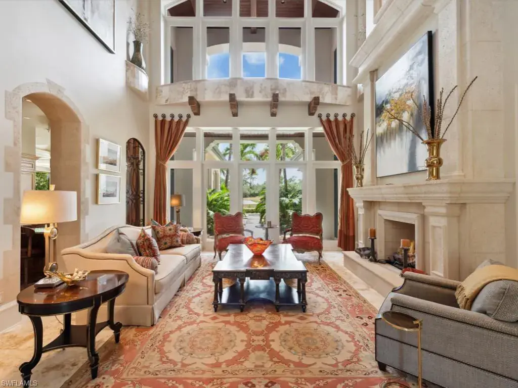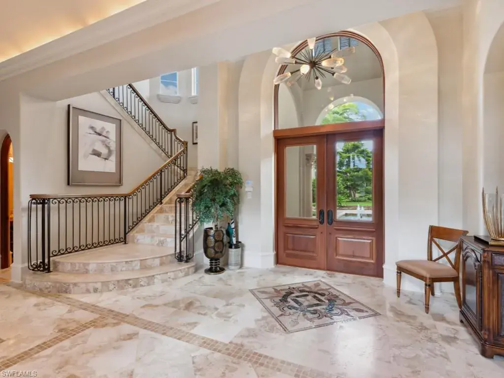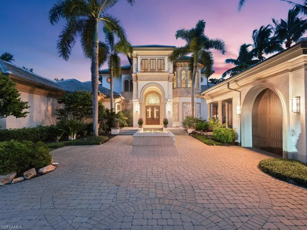 Discover the magnificence of this Harwick estate, situated amidst a sprawling stretch of golf course and lake vistas. A grand fountain entry offers an impressive welcome, leading to the luxurious five-bedroom residence with a versatile den and seven bathrooms. This opulent residence is a testament to refined elegance. Amenities include a modern theatre, a temperature-controlled wine cooler, a fully equipped wet bar adjacent chef-inspired kitchen, and spacious guest suites, all adding to the appeal of this architectural gem. The home’s grandeur is amplified by soaring ceilings with wood beam accents and abundant natural light from large windows. The outdoor space is an entertainer’s dream, with an expansive lanai, a state-of-the-art summer kitchen, an upgraded grill, and a covered seating area. The luxurious tropical pool and spa offer a serene retreat with stunning water features and an outdoor fireplace & seating area which adds a cozy touch to this awe-inspiring home in Mediterra; A prestigious luxury golf & country club community in Naples, featuring Two championship Tom-Fazio golf courses for avid golfers, a private beach club with a restaurant & bar, multiple tennis courts, pickle-ball & bocce, fitness center, pristine bike & jogging trails, and luxurious dining at the private country club restaurant.