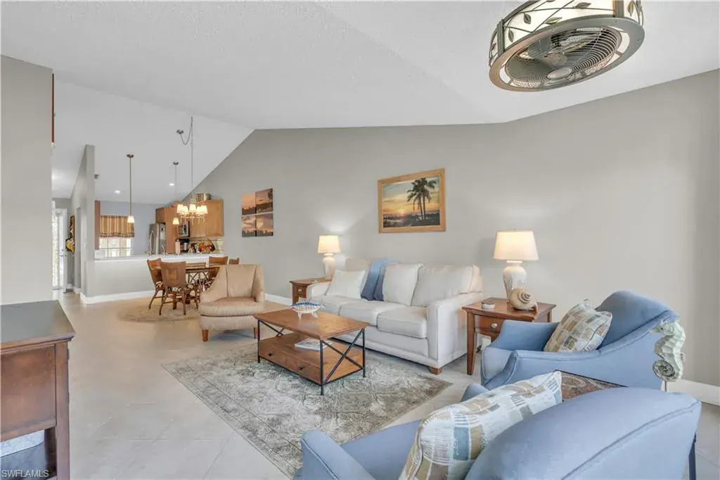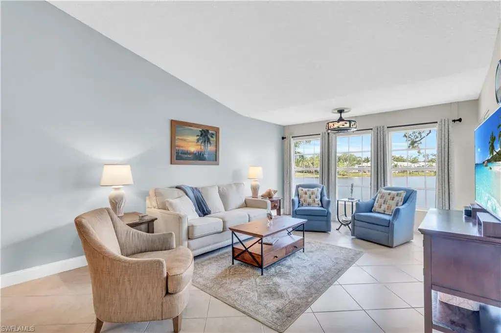 Refreshing! is the absolute correct way to describe this property. The seller created a lovely home out of the Evergreen floor plan. This floor plan rarely goes on the market. The long lake views are spectacular. The workmanship of the details on this property are second to none. The sellers’ have great taste in cabinetry…in the kitchen, the bathrooms, the walk in closet, and extra storage in the Dining/living area (where the plant shelf used to be). Even the interior doors are hand crafted and adorned with levers instead of knobs. The kitchen’s quartzite counters are impressive and actually glow when illuminated. Stainless steel appliances are found dress this kitchen well, including the small appliances! The glass back splash tile is a nice touch. The volume ceilings in the kitchen are enhanced by the perfect lighting choices. WAIT there is more…a reverse osmosis system under the sink in the kitchen with its own dispenser, fresh drinking water in every glass! The colors in the home are peaceful and tasteful. If you choose the furniture to go with this property, it’s top of the line, even the pull-out couch has the most comfortable adjustable mattress. The Primary Suite is UNIQUE to this condo. The sellers changed from a walk-in closet and separate bathroom, to a CUSTOM walk-in dressing room with ensuite attached, making both options very spacious. On the lanai, you will find a special place for your afternoon beverage as you watch the neighbors stroll around the lake, the birds swimming or sunning on the shore. Behind the PVC doors (easy to keep clean) your washer and dryer are waiting, preventing extra heat from entering inside the home. The HVAC System is relatively new and the water heater was REPLACED in 2024. The community pool is found just inside the entrance. Yes there is Tennis and Pickle ball located off of Buckingham inside Kings Lake for residents to play. Greenfield Village is located near the back entrance to the Publix shopping center where you will find coffee shops, ice cream & Cookies as well as a number of delicious options to dine out without having to get into busy traffic.