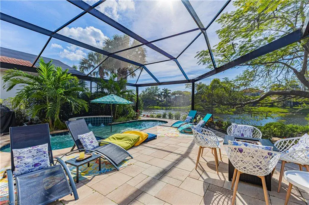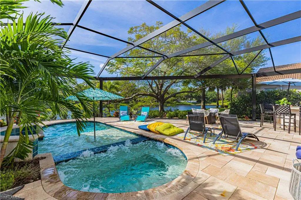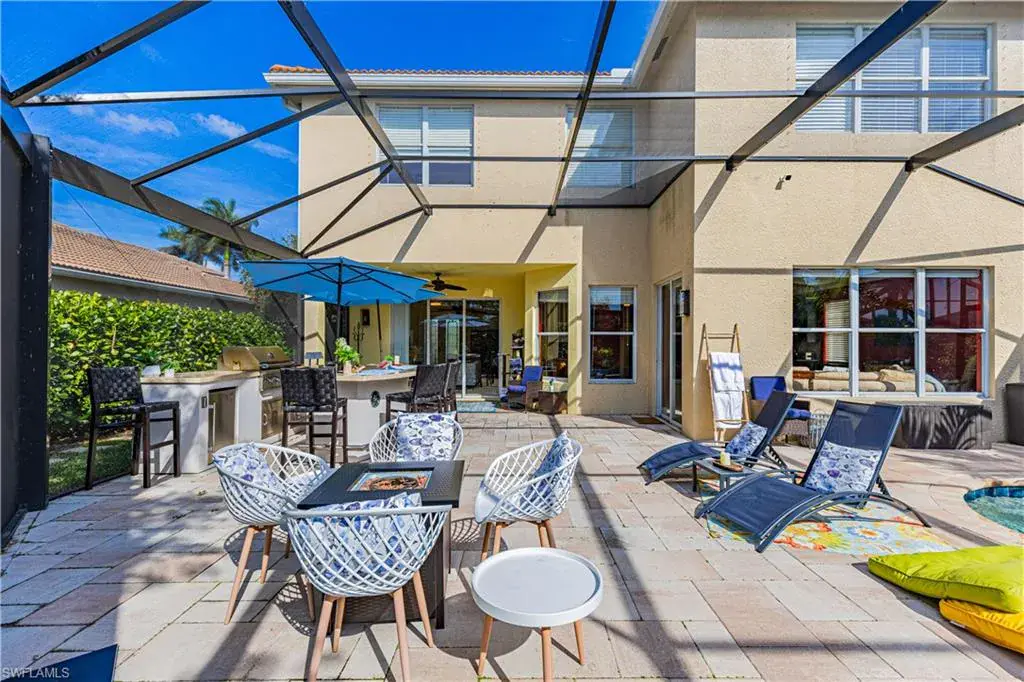 A must-see backyard! The home is 2904 sq ft with 5 beds, 3 full baths and 3 car garage. Enjoy beautiful sunsets from your western exposure backyard oasis. A one-of-a-kind salt water hot tub/plunge pool and large outdoor kitchen are perfect for backyard entertaining. The pool, pool cage and outdoor kitchen was installed in 2022. Beautiful outdoor kitchen with Italian porcelain countertops which is highly heat resistant and easy to maintain. The large master suite has enough space for a home office or relaxation spot. Guests will have their own bedroom and bathroom on the first floor. Sit back and relax with this well-maintained home with newer roof and AC units. The furniture is available if needed. Saturnia Lakes is an award-winning community that offers resort style living with 2 heated pools, hot tub, fitness room, dance studio, internet cafe, saunas, billiards room, ballroom, clay tennis courts, playground, basketball court, and putting green. With A rated schools and minutes from shopping and restaurants this is a must-see home that will not last. Sellers are NOT investors trying to flip a property.