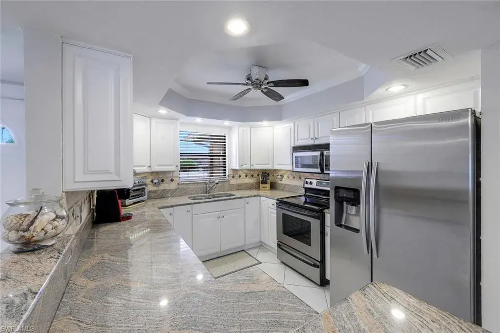 WOW! Amazing peaceful view! Welcome home to this beautifully renovated two bedroom, two bath, turnkey furnished condo in the heart of North Naples. Stunning 180 degree lake views and amazing sunsets as the lanai sets further out than any others in the building. Only 4 miles to Vanderbilt Beach and Delnor-Wiggins Pass State Beach Park! Completely remodeled kitchen with granite countertops, updated cabinets, undermount sink, stainless steel appliances, tray ceiling with crown molding, back splash, and LED lighting. Both bathrooms have been updated, other features include crown molding, tile on diagonal, dual granite undermount sinks in primary room with custom walk-in closet. Cypress Gardens is peaceful and relaxing 55+ community. The community pool is just a short walk out back and there is a good-size storage unit next door to store beach toys, bikes, and holiday items.