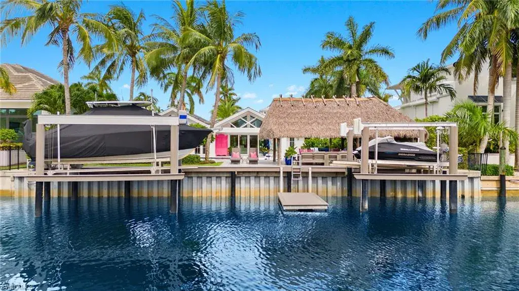 Welcome to 1960 Tarpon Road, Royal Harbor, Naples! Discover unparalleled luxury and sophistication, an exquisite coastal retreat in the prestigious Royal Harbor community. This fully remastered 3 bedroom, 3 bath home with a 2-car attached garage epitomizes high-end living. No expense was spared in its meticulous renovation and design. As you enter through the custom-designed iron door, you are greeted by an expansive open-concept living area featuring soaring vaulted ceilings with architectural beams. Elegant hardwood flooring flows seamlessly through all bedrooms and living spaces enhancing the home’s coastal charm. The heart of this home is the spectacular chef’s kitchen boasting an oversized island, premium quartz counters, and top-of-the-line appliances, including double Liebherr refrigerators, 48″ AGA Mercury induction range, Viking dishwasher, and a Bosch built-in coffee/espresso maker. This kitchen is a culinary masterpiece, perfect for both family meals and grand entertaining.The dining area, adorned with beautiful beams, opens into a spacious living room with custom built-ins and vaulted ceilings, designed to blend indoor and outdoor living effortlessly. Expansive walls of glass lead to a breathtaking tropical backyard offering a private oasis with western exposure, two distinct entertaining areas, and a charming Chickee Hut for year-round outdoor enjoyment. The marble-surrounded pool and spa, coupled with an outdoor shower, create a resort-like ambiance. The primary suite is a sanctuary of luxury featuring vaulted ceilings, beautiful French doors, and floor-to-ceiling windows that provide a serene view of the garden and pool. The en-suite bath includes a walk-in marble shower, separate vanities, water closet, and walk-in closet with custom built-ins. The two guest en-suites provide ample space and opulence each with walk-in closets and elegant bathrooms. One guest suite offers direct access to the rear yard making it a perfect pool bath. For boating enthusiasts this home is a true paradise. With 80 feet of pristine canal frontage, direct Gulf access, newer seawall, and dual boat lifts—one with a 13,000 lb capacity and the other with a 24,000 lb capacity—this property caters to all your maritime desires. Additional features include a floating dock, fishing table, and sophisticated lighting systems, ensuring a perfect waterfront lifestyle. This residence has been completely updated with the highest quality materials and craftsmanship including a tiled roof, high-impact resistant windows and doors, all new mechanicals, and custom cabinets. Its prime location offers convenience and exclusivity minutes from powdery white beaches, world-renowned shopping and dining of 5th Avenue and all the luxury amenities Naples offers. This exceptional home is more than a place to live—it’s a lifestyle. Don’t miss the opportunity to own this extraordinary property in one of Naples’ most coveted neighborhoods. Experience the ultimate in coastal luxury.