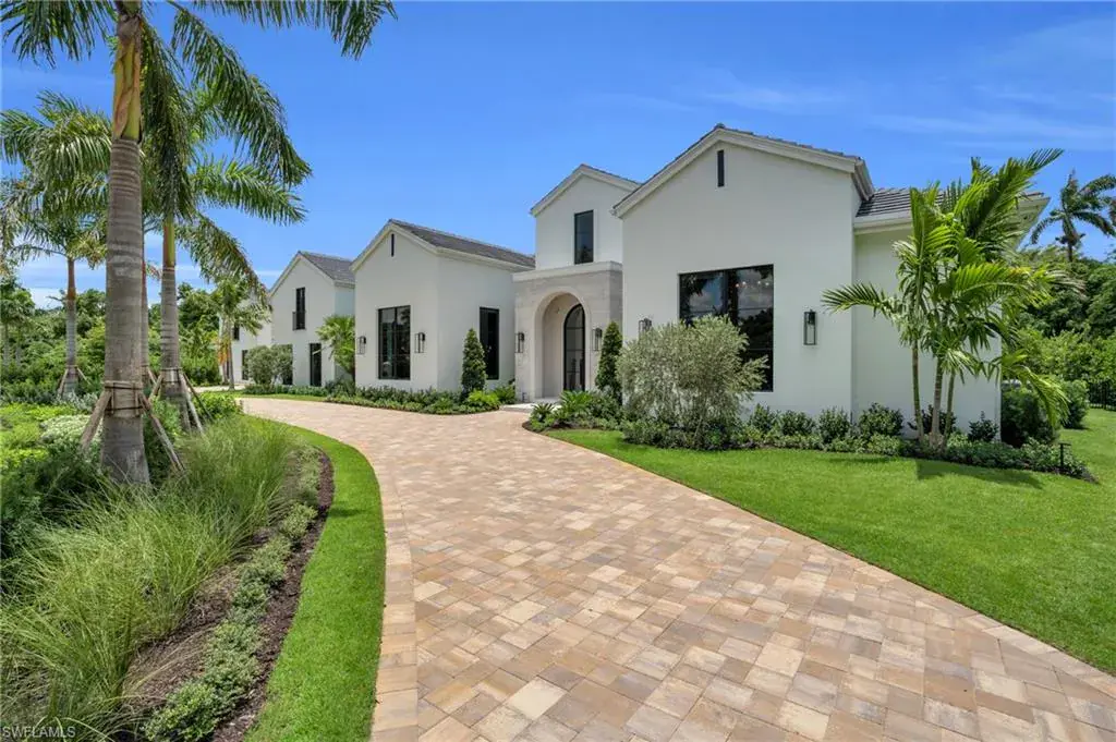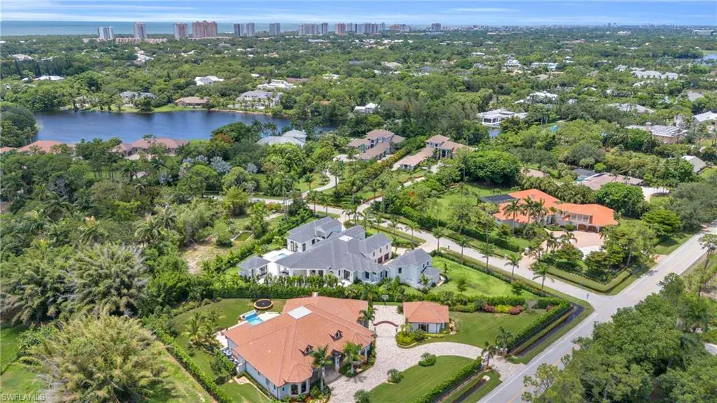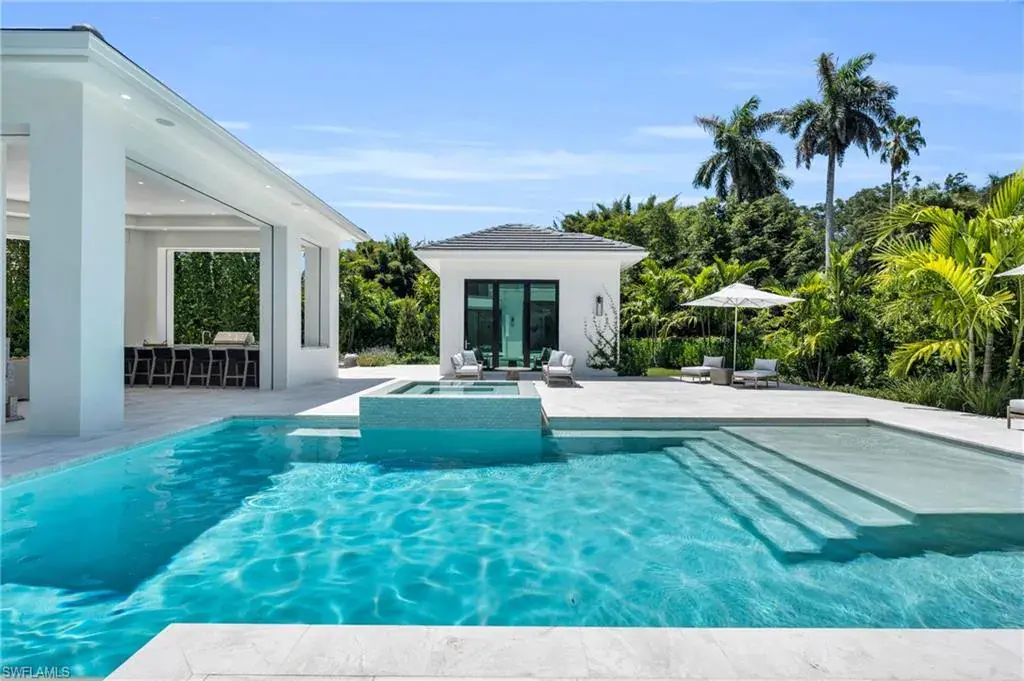 198 Caribbean Road, a truly magnificent estate home built with no expense spared by Borelli Construction, a premier luxury builder with over 4 decades of experience and excellence in Naples. Designed and furnished top to bottom by Carrie Brigham Design. This modern tudor is perfect for entertaining with its grand foyer overlooking reflection pools and long views to the separate pool house, extensive indoor and outdoor speaker system, temperature-controlled glass wine room, dining room with an expansive table, oversized marble and oak wet bar with beverage and wine fridges, and chef’s kitchen, not to mention the large game room with two bars, custom pool table, lounge seating and game table plus half bath. The kitchen’s top of the line appliances include a 36” SubZero refrigerator, 36” SubZero freezer, and 60” Wolf gas range. The main suite enjoys views of the reflection pools, has a convenient morning bar, and two separate generously sized closets. From the great room, pocketing sliders lead to the covered lanai with electric screens and storm shutters. The study has herringbone flooring with built in cabinets and white oak beams flanked by three large windows. The open outdoor kitchen provides service to guests inside the lanai as well as those on the massive pool deck flooded with southern sun with wrap around bar seating and a fireplace. A separate guest house includes a kitchenette, living/dining area plus a private bedroom suite. Unique details including the twelve foot tall euro wall sliding doors, beveled stone in kitchen island, wet bar stone shelving with integrated lighting, extensive use of white oak plank ceilings, custom made light fixtures, and over the top primary wet room exhibit the highest level of craftsmanship. Other features include a whole-house generator and reverse osmosis, extensive camera system, Lutron lighting and Control4 automation system, new septic & well, two 1,000 gallon gas tanks, low VOC paint used throughout, & five and a half car air conditioned garage. This home is conveniently located in the Pine Ridge neighborhood which is centrally located within Naples and provides easy access to shopping and dining.