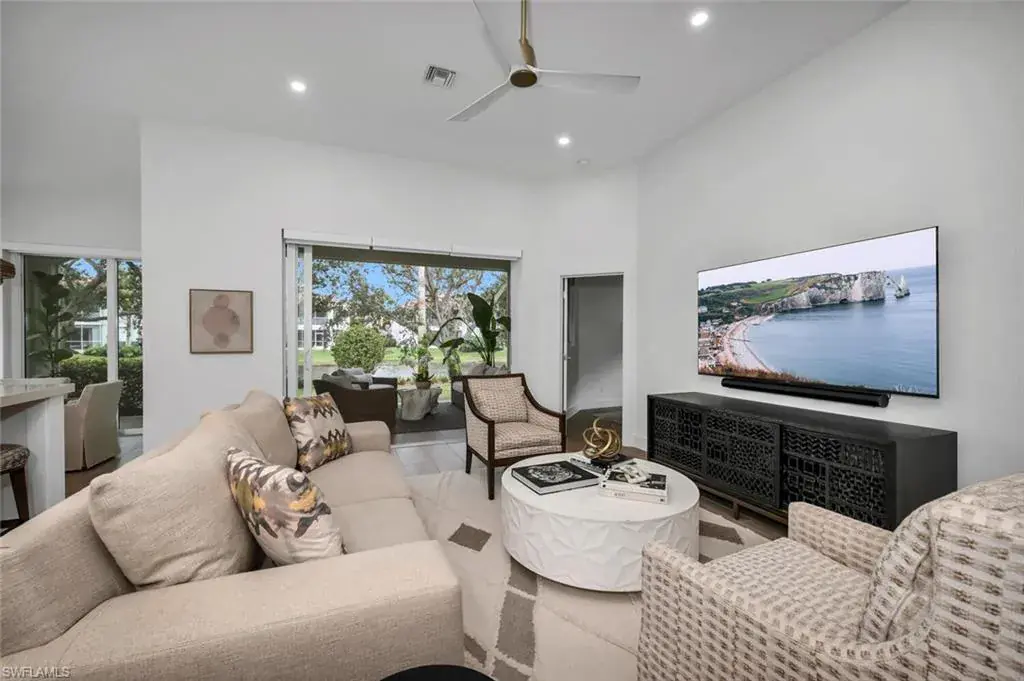 Amazing finishes in this gorgeous whole home renovation. This home has had walls moved for better flow, open great room/kitchen, privacy for guests, walk-in laundry and a large master closet. The roof was replaced in 2020. All other renovations were completed in late 2021: AC with Nest thermostat, hot water heater, whole home water softener & filtration system, flooring, hurricane windows and doors, all lighting, faux wood large plank tile flooring, kitchen appliances, washer, dryer, built-ins, solid wood interior doors throughout and hardware. The kitchen cabinets and bathroom vanities are brand-new with quartzite tops. Glass enclosed showers with all new tile and hardware. The lanai flows from the interior with the same tile with panoramic screen views of a waterway in Pelican Marsh. Designer furnishings complete this home. The exterior landscaping was replaced with new plantings and uplighting. There is room for a pool. Pelican Marsh Community Center has a fitness center, bocce, pickleball, tennis and dining. Pelican Marsh is centrally and conveniently located in North Naples.