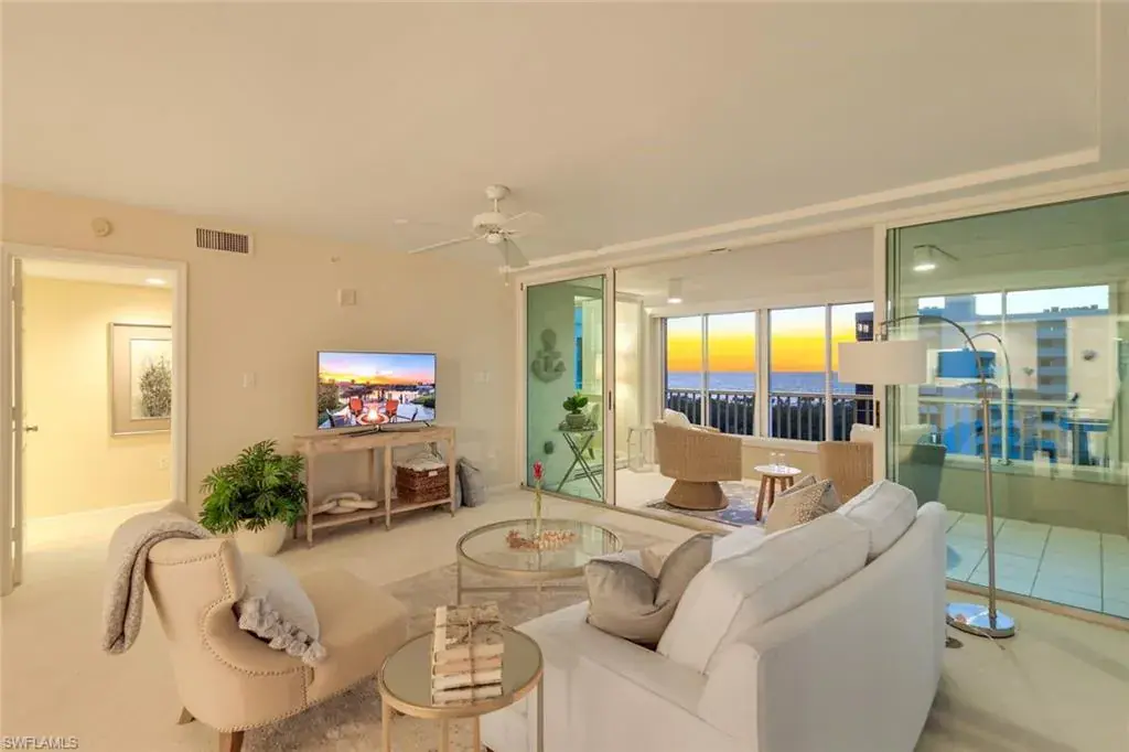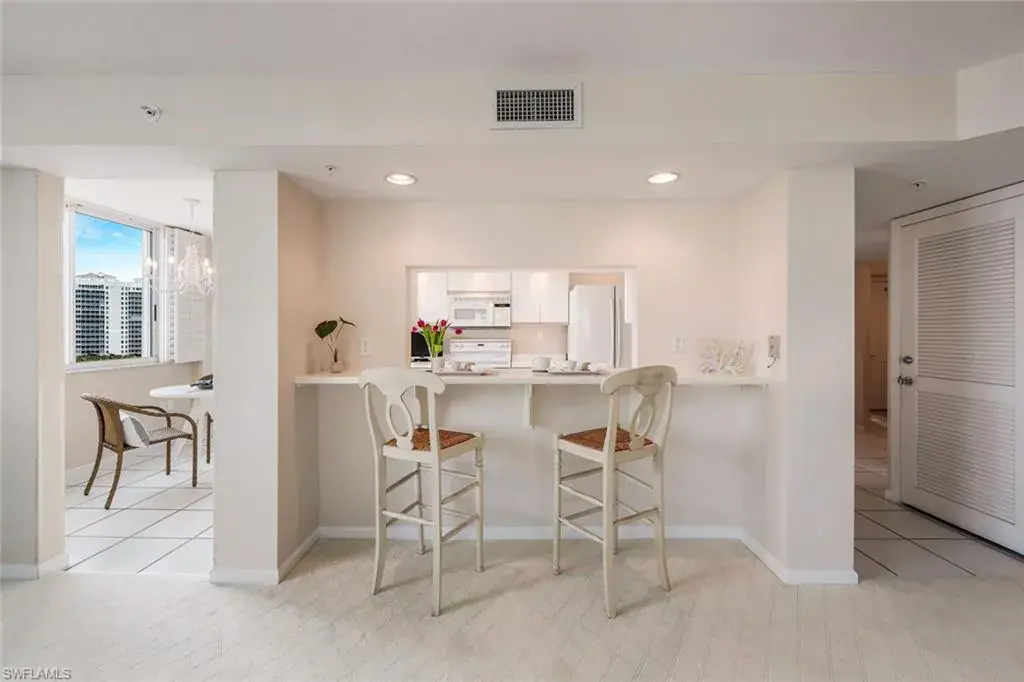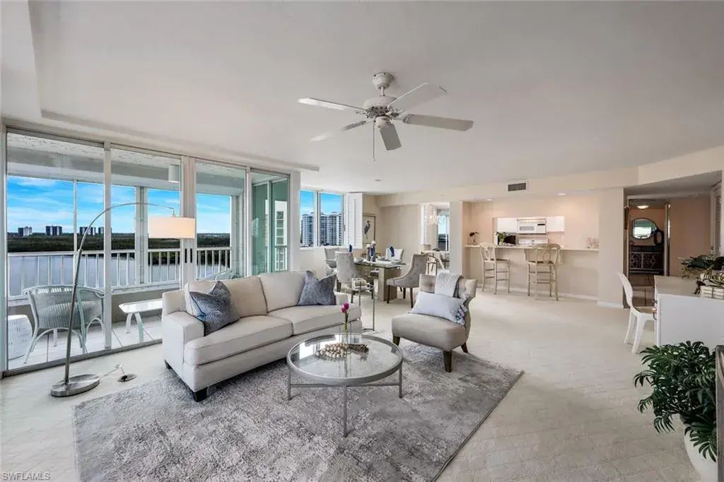 Amazing gulf & bay views from every window in this 9th floor end unit. Light and bright unit with expansive lanai and gorgeous views. Enjoy a spacious open unit with 2 bedrooms and 2 full baths and 2 lanai spaces. The kitchen features white cabinetry with Corian counter tops and breakfast bar as well as eat in dining space. Spacious guest bedroom with ensuite bath and private balcony for guests to sit back & relax and take in gorgeous bay views. Master suite has custom built cabinetry, ensuite bath with dual sinks, soaking tub and shower. This unit has newly installed upgraded carpet throughout living area and master bedroom, freshly painted, plantation shutters, hurricane shutters & private laundry room. 1 year home warranty for new buyer at closing. Fabulous location where you can walk to the pool or beach and are close to the newly renovated Ritz Carlton Hotel. Additional Storage Available For Residents To Store Pool Toys, Beach Chairs, Golf Clubs, Etc. as well as assigned parking spot. 1 year home warranty for new buyer at closing.