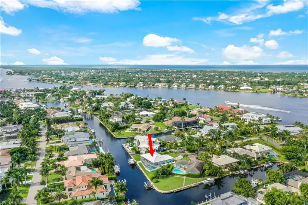 NO FLOODING OR DAMAGE! $400,000 PRICE DROP! MOVE-IN READY, TURNKEY FURNISHED, 20,000# BOAT LIFT, NEW KITCHEN! Spectacular 172 ft. of WATER FRONTAGE on a rare and coveted Tip Lot, sits this beautifully updated, move-in ready home! 172’ is the longest waterfront expanse on the market in Royal Harbor! The community, on Naples Bay, offers deep water, direct, no bridge Gulf access, minutes to 5th Avenue and the Beach! Long water views, wide canal, 20,000# Lift, and room for more boats and jet skis, make this home a Boater’s Playground! At the cul-de-sac, the light filled home, with new AC, is perched on a high lot with no traffic. Walk past the pristine landscaping, through the glass entry doors, to an open bright, casual living area and study or dining. The new kitchen was just completed with stainless appliances, gorgeous blue tiled wall, sharp hardware, and a triple window above the sink with views of the pool and water below. The master suite features dual closets, and a private water closet. Guest bedrooms are separate from the Master. Generous outdoor- living, features a sparkling updated pool and new deck. Step down to your boat that is for sale, for new adventures in paradise!