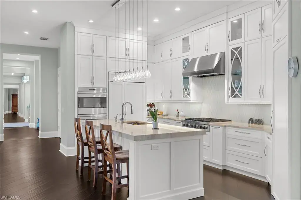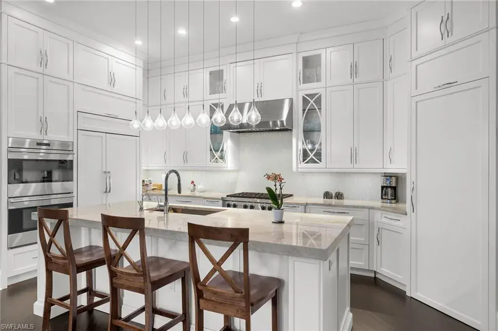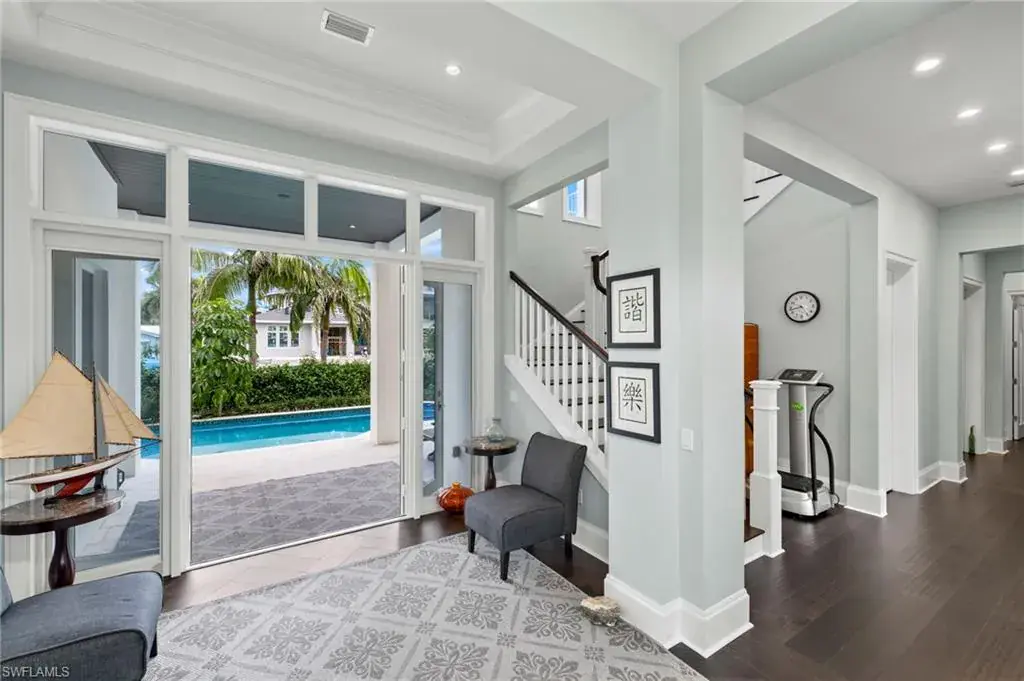 Welcome to 2275 Trout Court in prime Royal Harbor location. Custom built by local renowned builder, Big Island Builders, this exquisite waterfront home seamlessly blends the indoor outdoor lifestyle. With over 5500 square feet of casually elegant living space this 4 Bedroom, 5 full plus 1 half bath home is sited on almost 200 feet of canal frontage and is truly a boater’s dream with direct access to Naples Bay and the Gulf of Mexico. Open-concept living area featuring a Chef’s Eat-in Kitchen replete with Sub-Zero/Wolf appliances. Living Room with 60″ linear gas fireplace. Master suite on the first floor with pool access is a private sanctuary with views of the lush landscaping. Spa-like En-suite Bath and dual walk-in closets. Guest suite also with pool entry. Ascend the dramatic stairwell to the second floor or access it via your 4-stop elevator. A second Master Suite with private office plus sitting room with front and rear balconies plus additional guest suite. Third floor rooftop entertaining deck boasts stunning 360 degree bay, canal and sunset views. Saltwater pool, spa and sun shelf plus outdoor full bath. Truly exceptional.