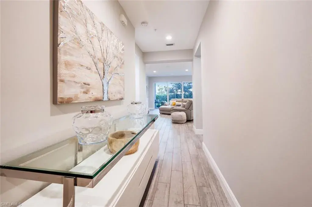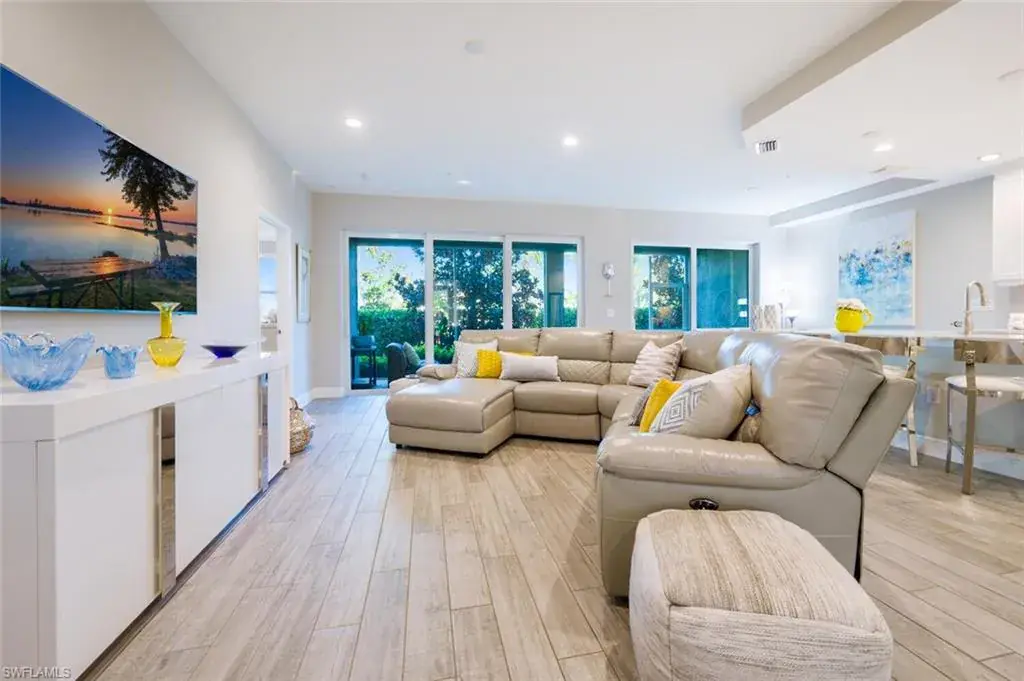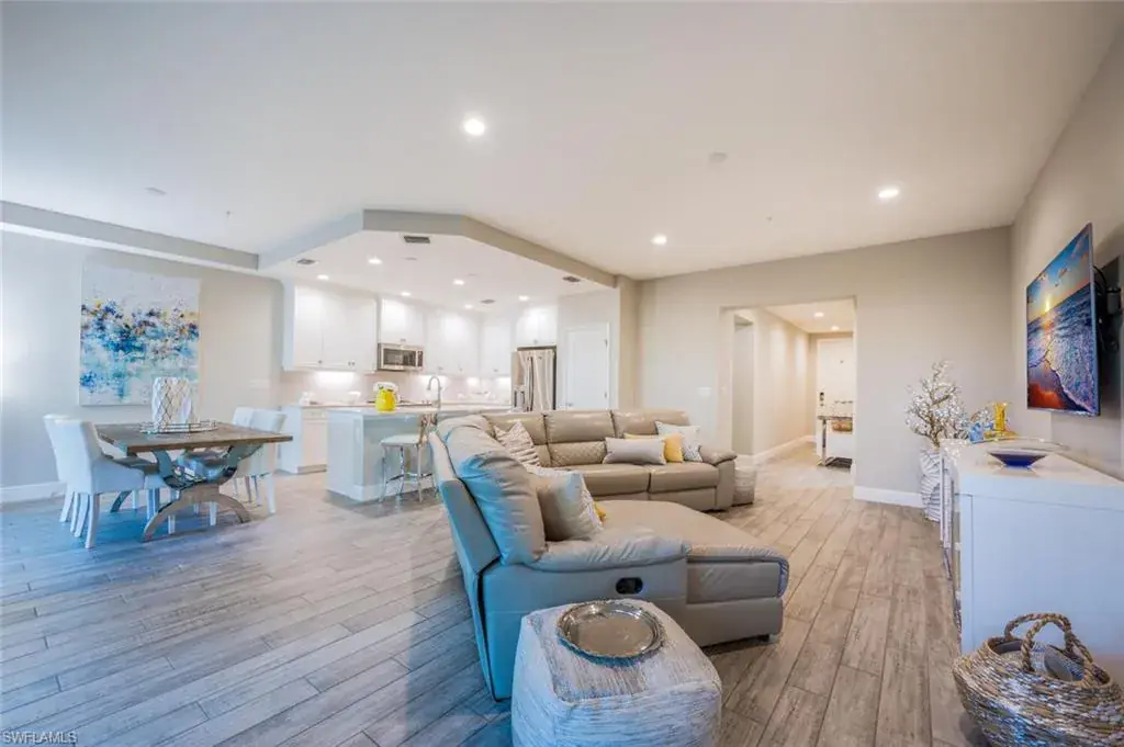This pristine 2 Bedroom/2 Bath “Kendal Model” is better than new, move-in ready and tastefully turn-key furnished with high-end fixtures and finishes featuring 1 car garage, white shaker cabinets, quartz countertops, stainless steel appliances & European plank wood-look tile throughout. The spacious primary bedroom features an enormous walk-in closet, double-sink quartz vanity and a lovely lake view. The large screened double lanai overlooks the lake & landscaped area accessible via 2 sets of impact sliders conducive to indoor/outdoor living with family and friends. Additional upgrades include garage keypad, smart entry door deadbolt with Z-wave technology, HD video doorbell, smart hub to connect Z-wave devise, structured wiring system to include five (5) cat 6 phones/data outlets & a smart thermostat with z-wave technology. Richmond Park a NO CDD gated community with coastal-themed carriage home buildings with only 104 homes. The community offers its own resort-style swimming pool and clubhouse located in the fastest-growing area in North Naples close to hospital, restaurants, grocery stores, gas stations & more. Just bring your toothbrush and begin your best “life-chapter” yet.