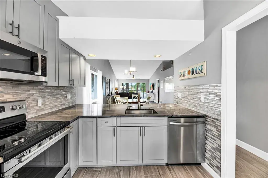 Beautifully renovated second floor two-bedroom condo with a long-lake view in Falling Waters. OFFERED TURNKEY! This property has lovely porcelain plank style tile throughout the condo. Grey Shaker wood cabinets and quartz counters in the kitchen and bathrooms. Stainless appliances. Both bathrooms are completely remodeled with new vanities and showers. THIS