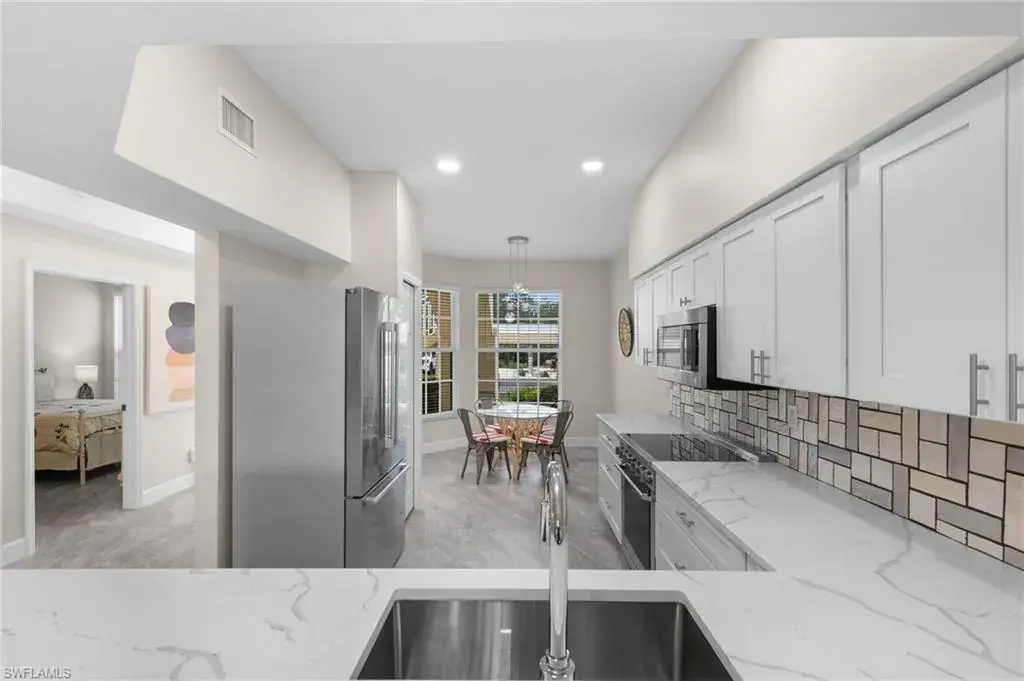 Experience the luxury of bundled-golf course living with immediate golf membership included in this spacious 2-bedroom, 2-bathroom condo, nestled within the prestigious Stonebridge Country Club. Perfectly positioned on the first floor, this sought-after residence boasts picturesque views of both the golf course and the adjacent lake, epitomizing tranquil elegance. The interior unfolds into a bright open-plan living area bathed in natural light, fostering a welcoming ambience. At the heart of this abode lies a gourmet kitchen, outfitted with contemporary stainless steel appliances and abundant storage space, making every culinary endeavor a delight. In 2021, the kitchen underwent significant upgrades, including new cabinetry, quartz worktops, a modern sink faucet, enhanced lighting solutions, and stylish 20×20 floor tiles, complemented by luxury appliances from Bosch and Electrolux. The primary suite, with its bespoke built-in wardrobes and new flooring, offers a blend of comfort and functionality, leading into a primary bathroom showcasing a glass-panel walk-in shower, freshly tiled surrounds, new cabinetry, quartz surfaces, and a recently installed toilet. Similar enhancements grace the guest bedroom and bathroom, featuring new flooring, baseboards, cabinetry, quartz countertops, and bathtub tiling. Living in this exclusive community opens doors to a socially engaging lifestyle, complete with access to pristine golfing facilities and the warm camaraderie found at the eagerly awaited Bistro. A world where leisure and connection seamlessly converge awaits in this vibrant enclave.
