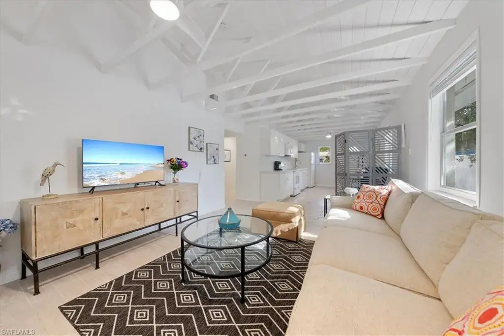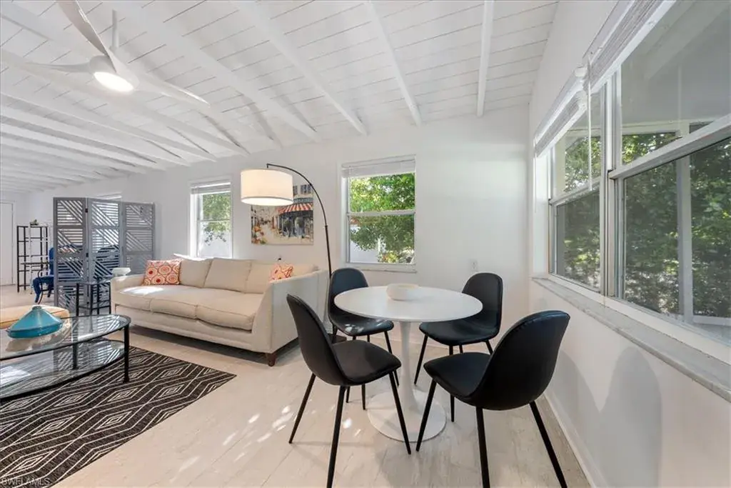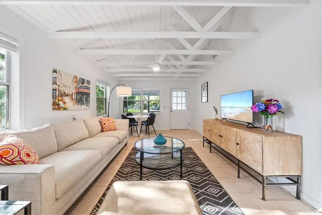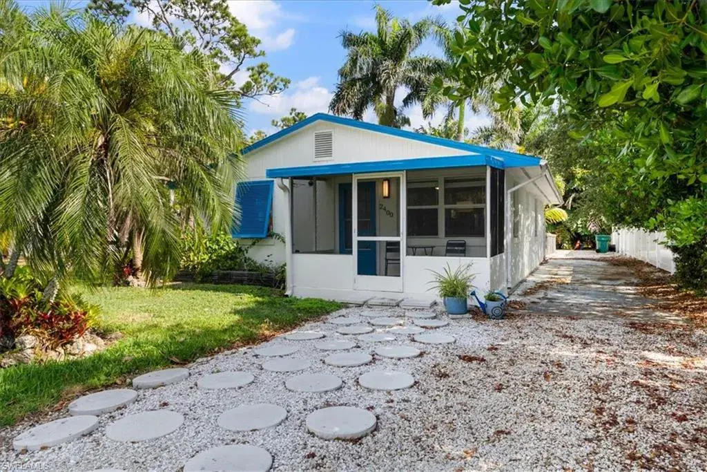 Adorable cottage available in Naples – NO HOA! This two-bed, one-bath home has been upgraded throughout in 2022, with ceramic tile, high vaulted ceilings, a beautiful backyard space with Southern exposure, and tons of light throughout! Perfect starter home or for use as an Airbnb, VRBO, or short-term rental! Offers a spacious and inviting floorplan with a wide open living area and TWO screened-in lanais! Enjoy the beautiful SWFL weather in front of the house, to the side, or in the backyard where your own private oasis with a beautiful pergola and comfortable seating awaits! The backyard also includes a single-car garage perfect for parking or for additional storage space, with a large driveway into the back with ample space for parking. Quiet neighborhood with no thru traffic! Enjoy the growing Bayshore area, close to downtown, the Botanical Garden, parks, beaches, and more!