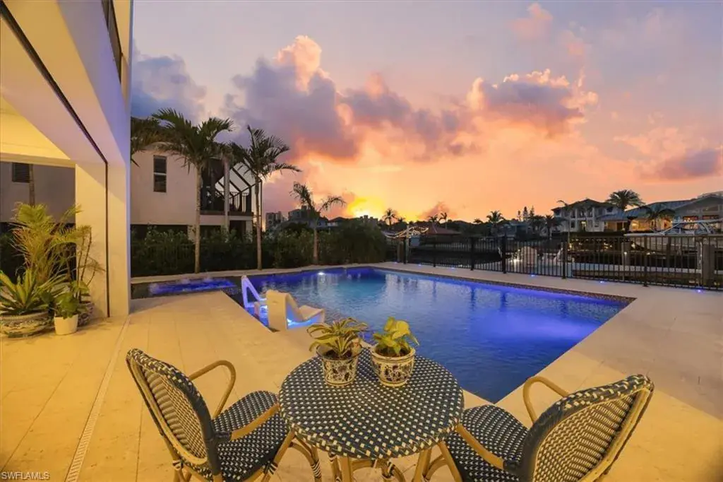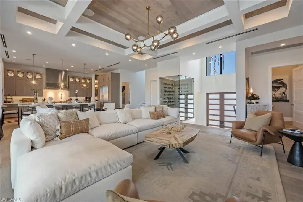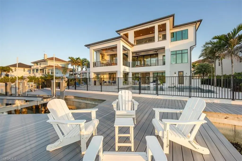 Coastal Luxury Meets Gulf Access – A Masterpiece in North Naples. Welcome to your waterfront dream home! Exclusive boating community, where luxury, craftsmanship, and coastal living collide in spectacular fashion. Built for the discerning buyer, this newer construction estate offers direct Gulf access, stunning sunsets, jaw-dropping interiors, and every amenity imaginable—from a private dock with a 20,000 lb lift to an in-home elevator and resort-style pool. Boasting 4 spacious bedrooms + den, 6 designer bathrooms, and a 3.5-car garage, this coastal contemporary showplace blends thoughtful architecture with flawless function. Soaring 12-ft volume ceilings with inlaid Montpellier White Oak, and engineered Montpellier White Oak flooring (no carpet, anywhere) elevate every inch of the open-concept living space. Recessed lighting and 8 ft shaker interior doors throughout. The chef’s kitchen is a work of art, featuring custom Woodmode cabinetry, 3” Lincoln Quartz waterfall counters, a full Thermador appliance suite, and a hidden walk-in server pantry with wine cooler and water filtration. Want more luxury? How about picture-framed 85” TVs, two owner’s suites with custom closets, and spa-inspired baths—including a freestanding Miseno tub and dual Moen rain showers. And the views? They’re unbeatable—thanks to floor-to-ceiling impact glass, 90° sliders, and 45 sq ft of fixed glass in both owners’ suites for panoramic pool and canal vistas. Outside, your steps from the water with 80 feet of canal frontage, a new seawall, and resort-style saltwater pool + 360 spa surrounded by Shell Stone pavers and tropical landscaping. Grill out in the outdoor summer kitchen, unwind in the covered 1600+ sq ft lanai, or entertain in the poolside bar and lounge—this home was built to host. Security and efficiency are top-of-the-line, with a Savant media and surveillance system, CAT 6 wiring, Sonos sound, electronic storm shutters, a Generac home generator, propane tank, and tankless water heater. You can walk or bike to the beach in a quiet neighborhood. Dining and everything that makes Florida living iconic are also close by. Whether you’re a weekend warrior, full-time water lover, or savvy investor, this home checks all the boxes. This isn’t just a home—it’s a lifestyle statement—Gulf access, luxury living, and peace of mind all rolled into one