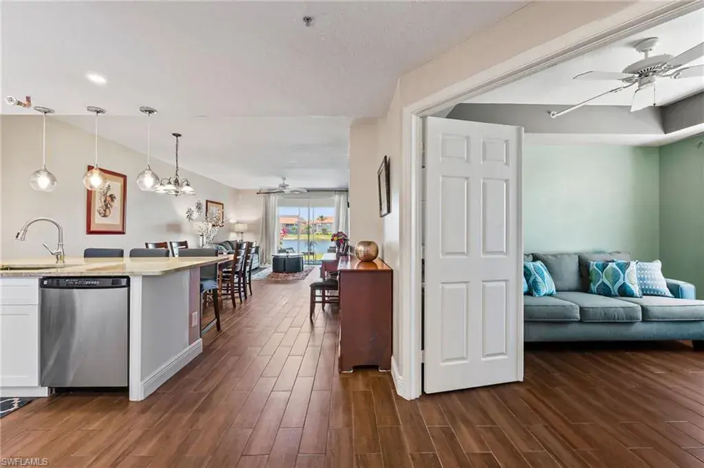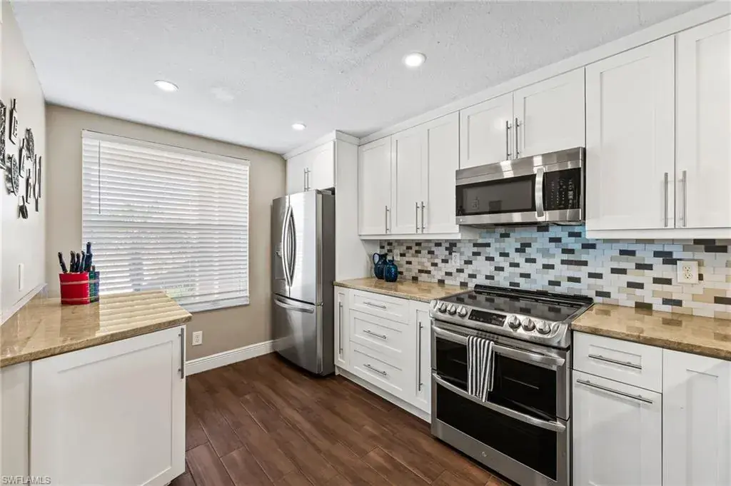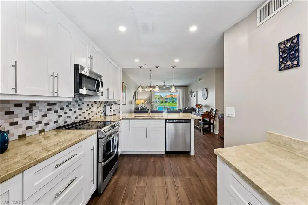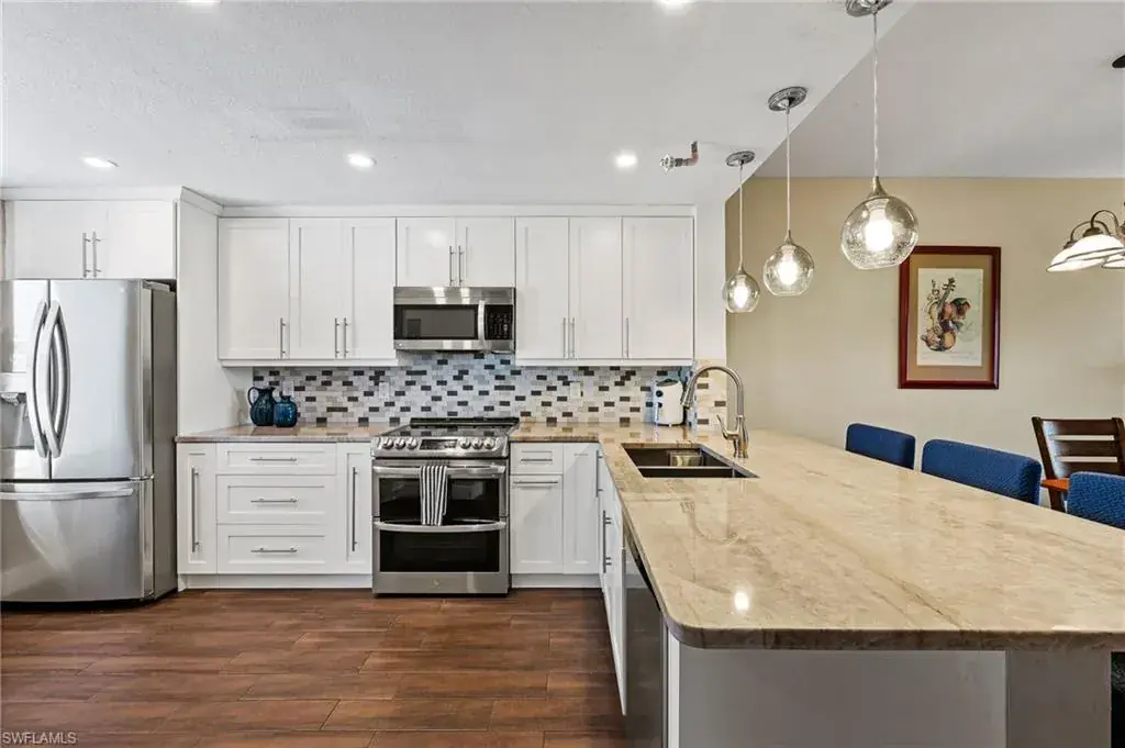 Beautiful, fully renovated, lakeside condo in desirable North Naples community of Huntington Lakes. Open floor plan. Kitchen with new cabinets, quartz countertops, stainless appliances, recessed and pendant lighting, coffee bar, 3 years new. Completely remodeled bathrooms including sinks and vanities, lighting, shower tile, floor tile.