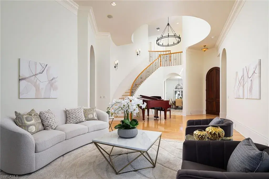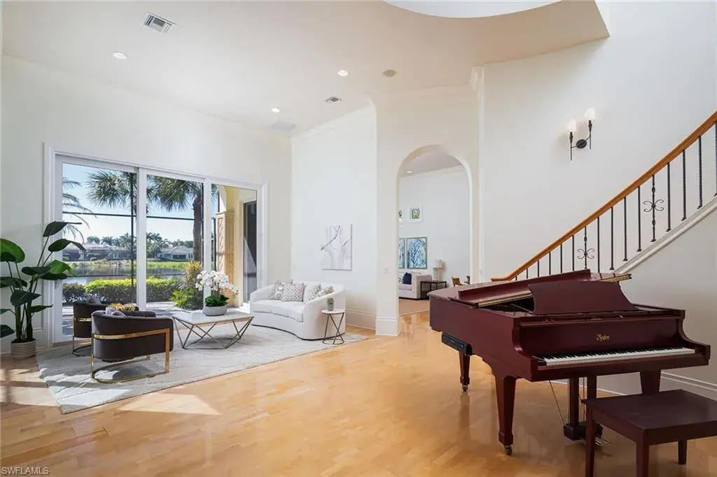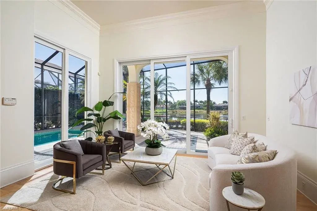 Presenting a rare opportunity to own this sunlit home with sweeping vistas of the lake, closing hole of the Palm Course and elegant award-winning Grey Oaks Country Club. Whether you’re entertaining guests or enjoying quiet evenings with family, the surrounding beauty provides the ideal setting. Features include 12- and 14-foot-high ceilings, 14-inch crown molding, new roof installed in 2022, freshly painted interior and exterior, and well-appointed kitchen with gas stove, and impact resistant sliders. The primary bedroom and den are on the first floor with the additional three bedrooms on the second floor providing plenty of space for family and guests. The private patio facing south invites you to soak up the Florida sunshine and revel in the serenity of your surroundings. With its incredible views and sought-after location in Naples, this property embraces an upscale and comfortable lifestyle ready for you to experience. Grey Oaks has state-of-the-art amenities including three golf courses, a 30,000-square-foot wellness center, active tennis, pickleball, fitness and social programs. Old Naples, fine dining, beaches, and international and private airports are easily accessible.