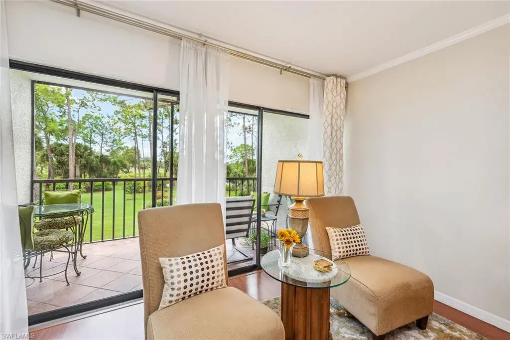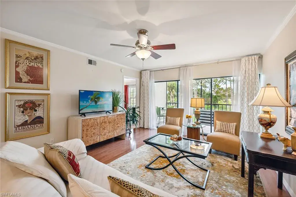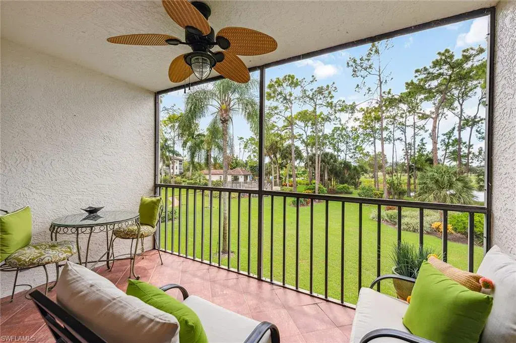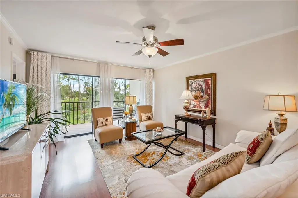 Elevate your living experience with this enchanting second-floor condominium at Gleneagles in Lely Golf Estates. This two-bedroom, two-bath residence is on a cul-de-sac, offering a blend of privacy and convenience. When you step inside, the allure of the screened-in lanai and spectacular view beckons. Framed by mature trees and beautifully manicured landscapes, it sets the stage for ideal morning coffees and twilight dinners. Crown molding flows throughout the interior, adding a flair of refined craftsmanship and understated elegance. The fully equipped kitchen features a tray ceiling, white cabinetry, granite countertops, three-seater breakfast bar, built-in wine storage and a pantry. Natural light streams generously into the adjacent dining and living areas that share a built-in dry bar with a matching granite countertop and wine cooler. The spacious primary bedroom offers gorgeous views and a three-piece en-suite bath with a shower and tub combination. As a resident of Gleneagles, enjoy the community pool nearby and a deeded carport and storage in a friendly neighborhood with a full social calendar. Just 15 minutes from downtown Naples and Marco Island’s beaches!