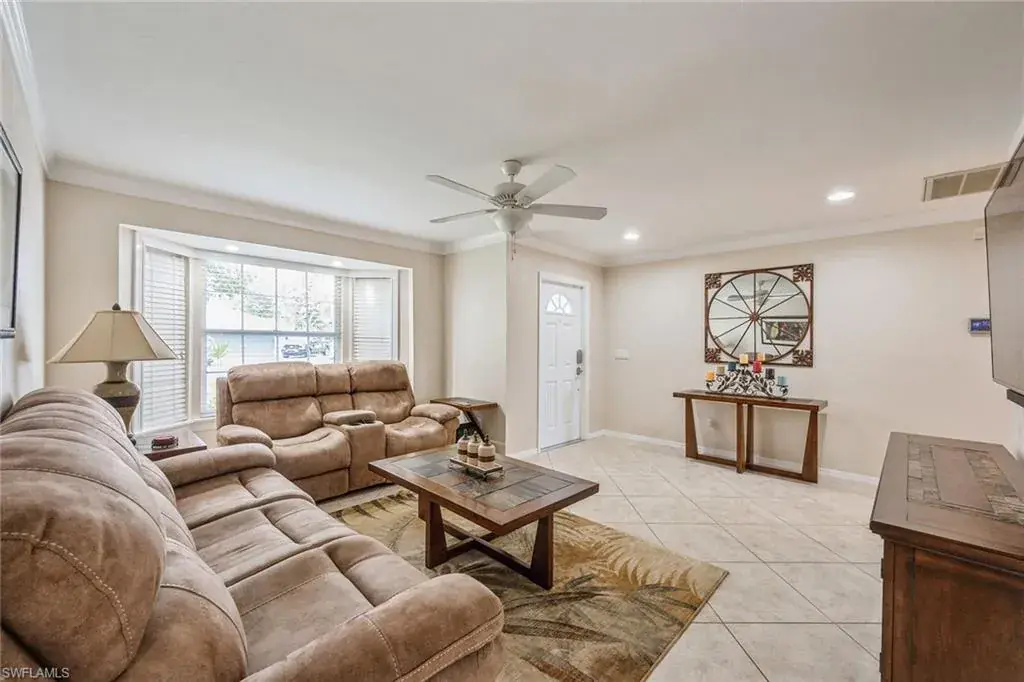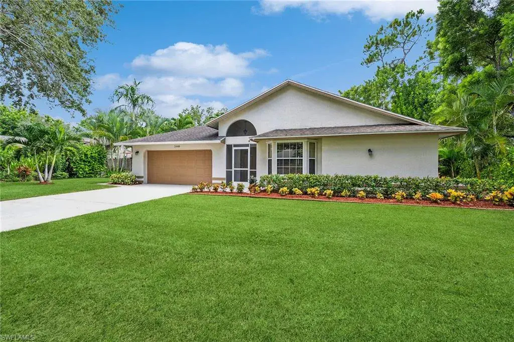 Meticulously maintained, beautifully updated, and artistically landscaped best describes this three-bedroom two-bath pool home. Pride of ownership is obvious here! This home lives large, with a total living area of 1,835 square feet under air. Third bedroom is set up as an office to comfortably work from home. French doors from the office and bedroom open into the large 26-by-17-foot family and flex room used as a fitness room. The great room boasts an abundance of natural daylight and is suited for your needs as a living room, a billiards and recreation room, expansive dining and entertaining area, or media room. Take a look at this .25-acre private and landscaped backyard! Most desired southern exposure offers full sun on the like-new saltwater pool system. New Hot Springs spa. All top of the line mounted TVs stay. A one year Choice Home Warranty is offered. Located near downtown Naples, Naples Botanical Garden, Celebration Park, 5th and 3rd avenues, and white sandy beaches. Low annual HOA dues of $516. For an additional $450 per year, you have the option of joining Coconut River Estates next door with its boat ramp, heated pool, tennis, pickleball, dog park and pavilion.
