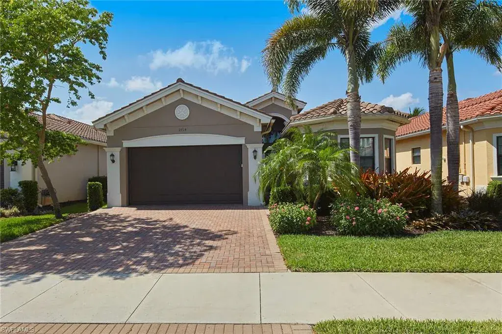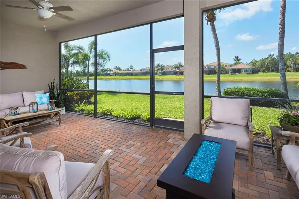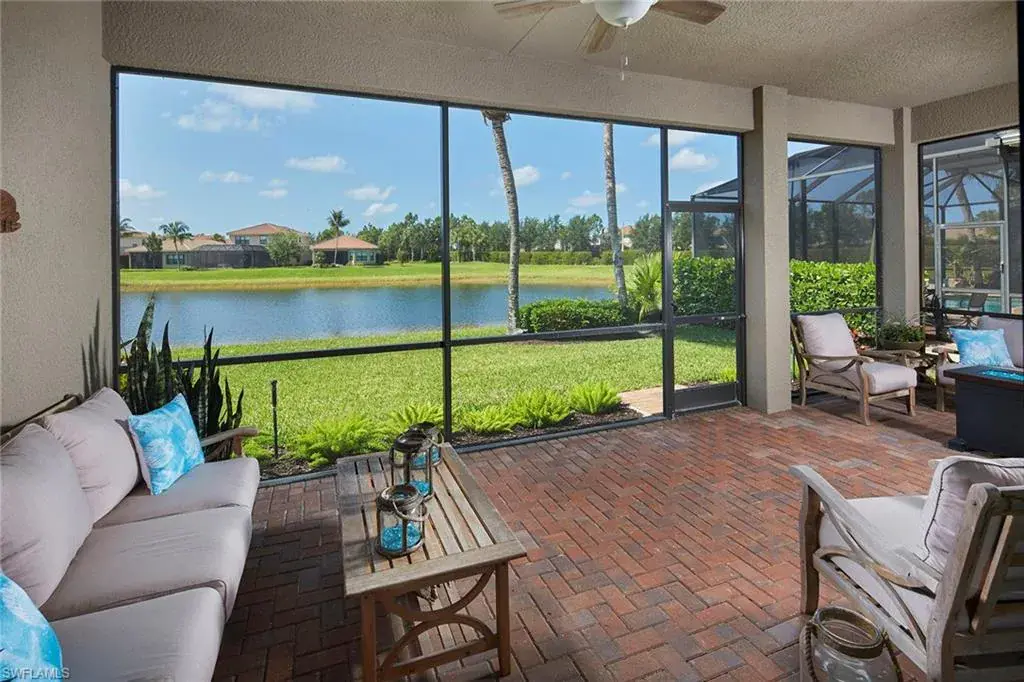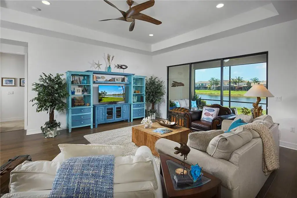 Open floor plan offering volume/coffered ceilings make this a bright and functional floor plan versatile for family living and entertaining guests. Wood floors in the main areas, a built-in serving buffet in the dining room, and the dark wood kitchen cabinets are enhanced by a deep turquoise backsplash. Four bedrooms (4th BR with French doors currently used as a den) with three full baths and an attached two-car garage. The extended L-shaped paver lanai with access from both the kitchen and great room has ample room for cooking, relaxing, and dining. Room for a pool, but not needed as there are many swimming and water activity options to enjoy within the community. Located in Riverstone, one of North Naples’ premier single-family gated communities is comprised of 300 acres with natural preserves and 12 lakes. The community offers sidewalks, streetlights and five-star resort amenities, which include a 13,000-square-foot clubhouse, a resort-style pool, lap pool, tennis, spa, splash pad, indoor and outdoor basketball courts, pickleball, fitness, game room, playground and numerous year-round social activities. Just a short drive to the beach, shopping, golf courses and a wide variety of entertainment and dining establishments and located within a very desirable school district.