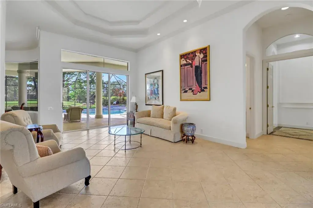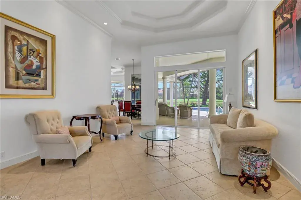 This 3 BR plus den, 4 BA home with a 3-car garage overlooks both a beautiful lake and the 16th fairway of Olde Cypress. Add to that a view framed by the cascading waters of your relaxing pool/spa area. The spacious kitchen features granite countertops, a large island, built-in desk, wine cooler and pantry. Enjoy your breakfast looking out of the bay windows toward your pool. You will find built-in shelving and a custom entertainment center in the large family room leading to the dining area. The master bedroom is large with a sitting area and bay windows Closet doors are framed by mirrors and French doors bringing your outdoors area indoors, so enjoy the view! The master bath has a jetted tub and dual sinks. The Olde Cypress community is centrally located in North Naples with lots of shopping and restaurants close by including the impressive Mercato complex with its movie theaters and so much more. Only six miles or so to beautiful sand white beaches and Delnor-Wiggins State Park!