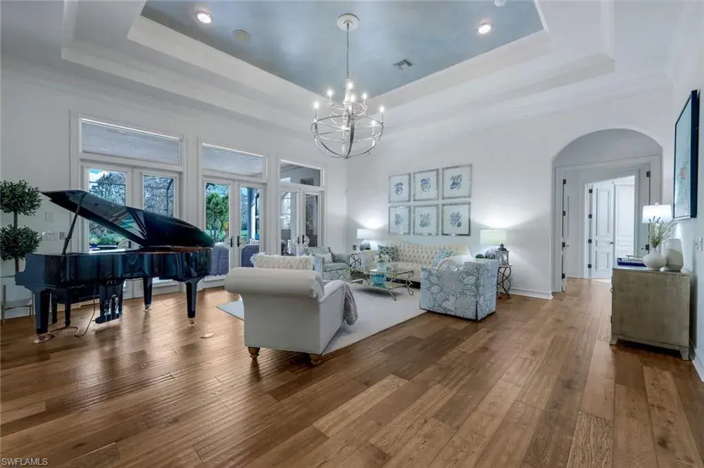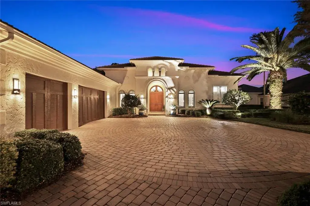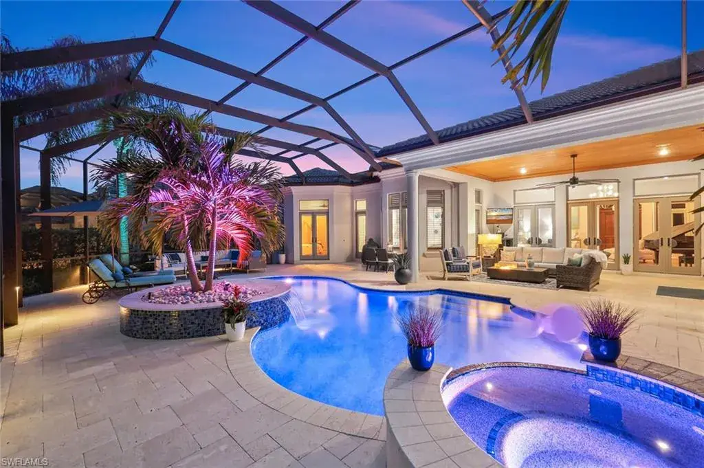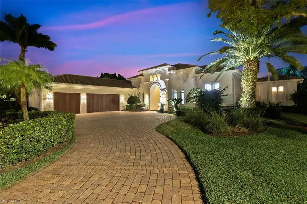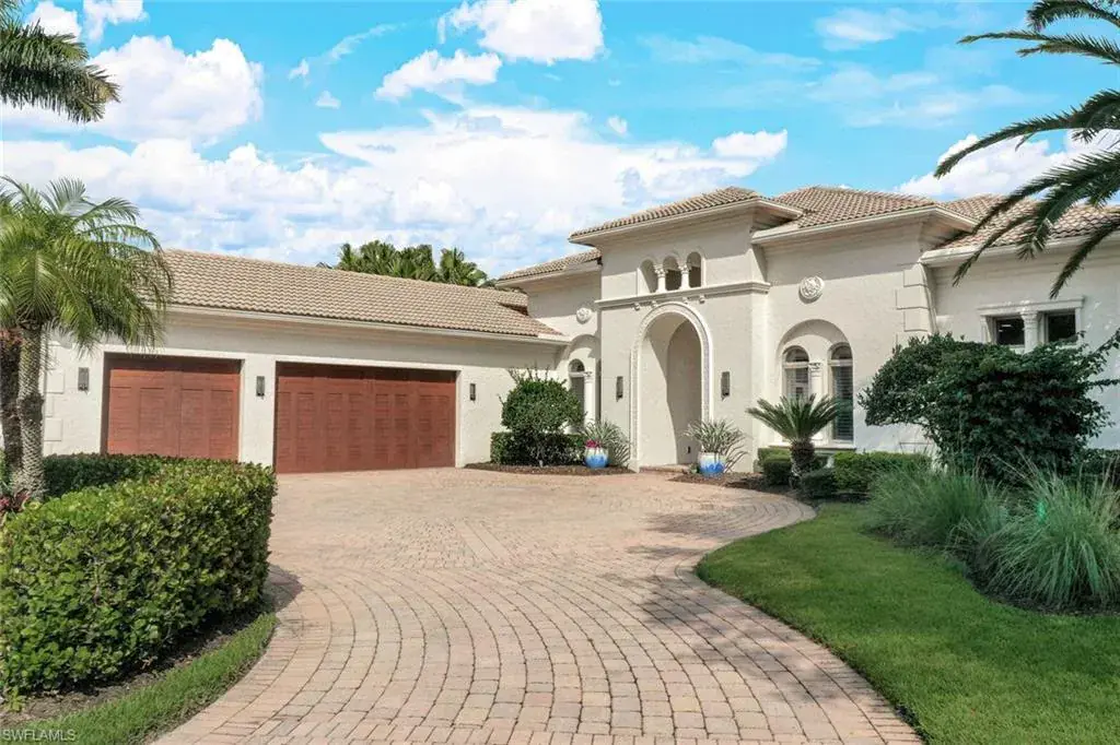 Step into your dream home & discover the allure of this exquisite residence within Olde Cypress community in Naples. Housing four bedrooms, a den, and five bathrooms (including the guest cabana, which was an addition in 2020), this home has been meticulously designed to meet your every need. Imagine preparing meals in the gourmet kitchen adorned with Wolfe + Meile appliances, brushed Carrara marble countertops, a Sub-zero refrigerator, and a spacious walk in pantry. The open-concept layout provides panoramic views of the exclusive 18-hole championship golf course designed by P.B. Dye and artistically designed resort-style pool and spa. The outdoor area, dotted with palm trees & travertine flooring offers an atmosphere of tranquility. It includes a built-in kitchen, lounge area under a spectacular peck cypress ceiling. Additional features such as a cascading spa, water features, and LED pool lighting maximize the enjoyment of Florida’s outdoor lifestyle. The primary suite is generously sized and includes a spa-like bathroom with a modern style free-standing tub, stand alone shower, dual sinks, stylish vanities, and Carrara marble counters. Custom walk-in closets add to the suite’s comfort and elegance. The home also has beautiful marble and Wine Oak Barrel Wood flooring throughout, coffered ceilings, five sets of French doors providing access to the outdoor area, a three-car garage, and a circular driveway. Home is furnished with some exclusions (see list in supplements). Golf & social memberships are available. Residents of Olde Cypress benefit from amenities like tennis and pickleball courts, fitness facilities, and dining options in the 36,000 sqare foot community clubhouse. For a private tour of this impressive property, call today.