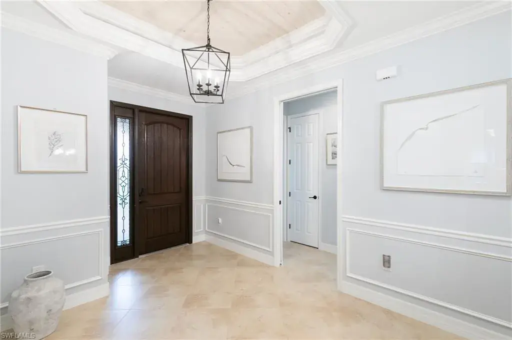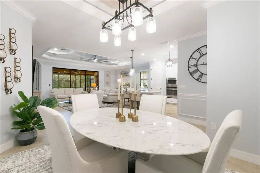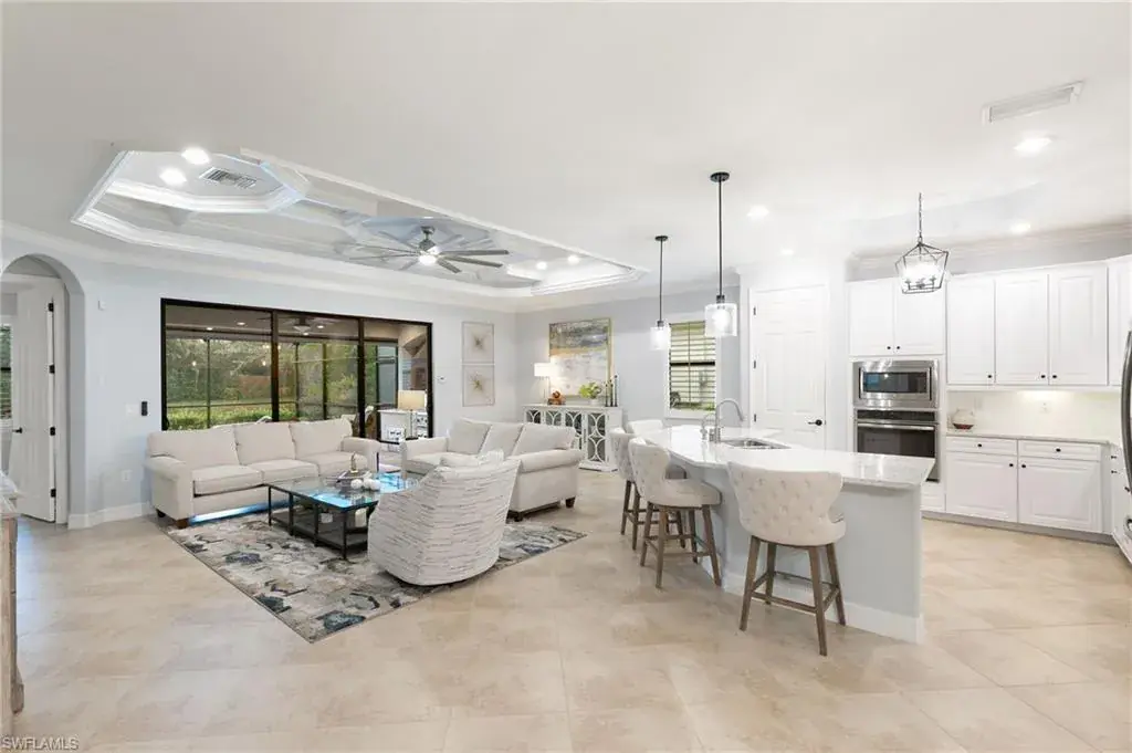 Discover refined coastal elegance in this light-filled, impeccably-upgraded former model home nestled in the prestigious, award-winning Fiddler’s Creek community. Boasting 4 bedrooms and 2 baths, this exquisite residence offers a seamless blend of luxury, comfort, and tranquility. Step into the sophisticated great room, where custom crown molding, rich wainscoting, and coffered and tray ceilings create a warm and welcoming atmosphere perfect for gatherings. The adjacent gourmet kitchen is a chef’s dream, featuring quartz countertops, crisp white cabinetry, a natural gas cooktop, stainless steel appliances, an instant hot-water faucet, and a large island ideal for cooking and conversation. Wide sliding glass doors open to a spacious screened lanai, where stunning lake views and resort-style amenities await. Enjoy a heated pool and spa, built-in BBQ, outdoor refrigerator, and ample space for lounging and entertaining—truly an outdoor oasis. The primary suite is a private retreat, complete with tray ceilings, direct lanai access, custom walk-in closets, and a luxurious 5-piece en suite bath designed for relaxation. Additional upgrades include, impact glass windows & doors, automated storm screens, full-house Generac generator, Lennox HVAC system (August 2025), Pentair pool pump (August 2025), and spacious two-car garage. The award-winning, resort style community of Fiddler’s Creek is enhanced by a club and spa, fitness center, swimming pools, two golf courses, tennis courts, pickleball courts, a bocce court, fine and casual dining, social activities, and miles of biking and walking paths. Optional beach club and marina memberships are available. Experience the epitome of luxury living, where every detail is thoughtfully curated to complement your lifestyle.