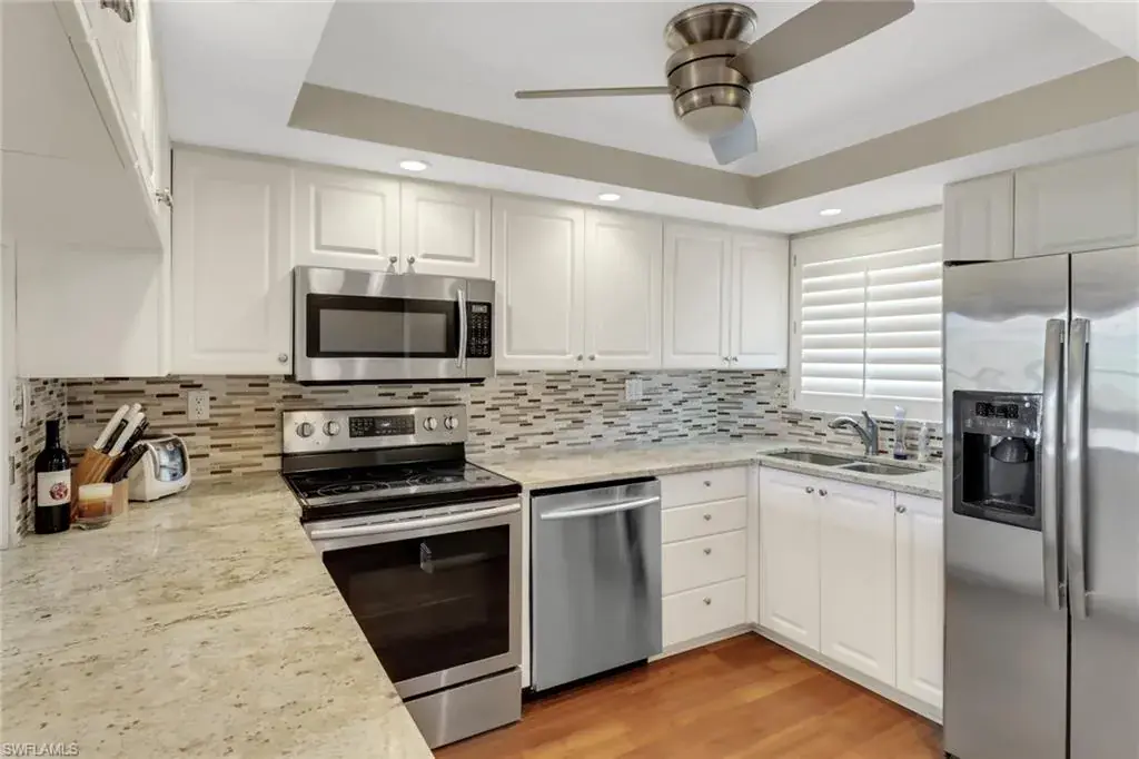 REDUCED FOR QUICK SALE. Enjoy sunset views over the golf course, lake and fountains from the screened lanai. The condo has been totally updated and includes stainless steel appliances, plantation shutters, granite counters, updated bathrooms, high-impact/insulated glass windows. Tastefully furnished, just bring your personal items. Enjoy High Point Country Club amenities, 9 hole golf course, six pools, tennis courts, pickleball, fitness, and a clubhouse with a seasonal restaurant, all included in the quarterly dues. One covered parking space plus guest parking, laundry in condo. High Point Country Club is located approximately 1 mile from the beach and surrounded by fine dining and shopping. This is a 55+ building and a non-smoking building.