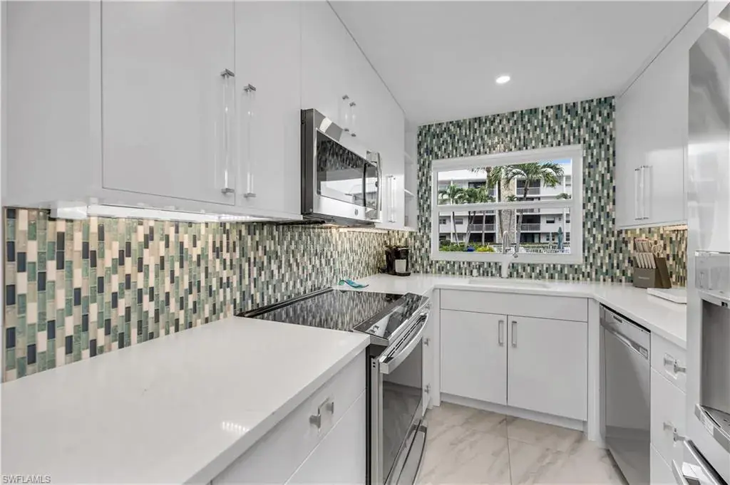 Experience the best of Naples living in this freshly remodeled, move-in-ready Harbour Cove residence, boasting over $265K in renovations and offered turnkey with modern furnishings and décor. The sleek GE Profile kitchen is fully equipped, complementing the coastal charm of this inviting home. Enjoy serene sunrise views over Outer Doctors Bay, where dolphins often play, and take advantage of resort-style amenities including a heated bayside pool, Chickie hut with shaded dining, boat slips (accommodating up to a 34′ vessel), kayak launch, and fishing station just ¼ mile north of Doctors Pass. Beach access is a short stroll away, with Venetian Village within walking distance and downtown Naples just minutes by bike or car. Featuring in-unit laundry, first-floor walkout convenience, on-site management, and a friendly 68-unit community known for its active social scene, this is your perfect slice of coastal paradise at Harbour Cove.
